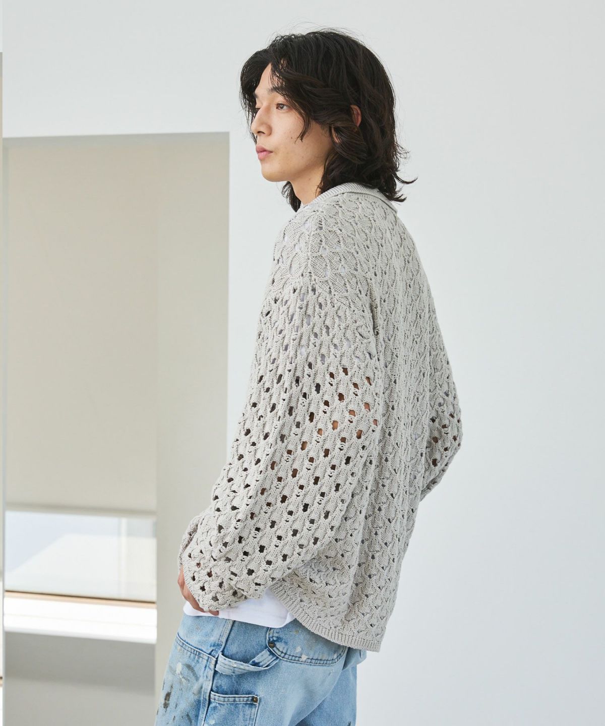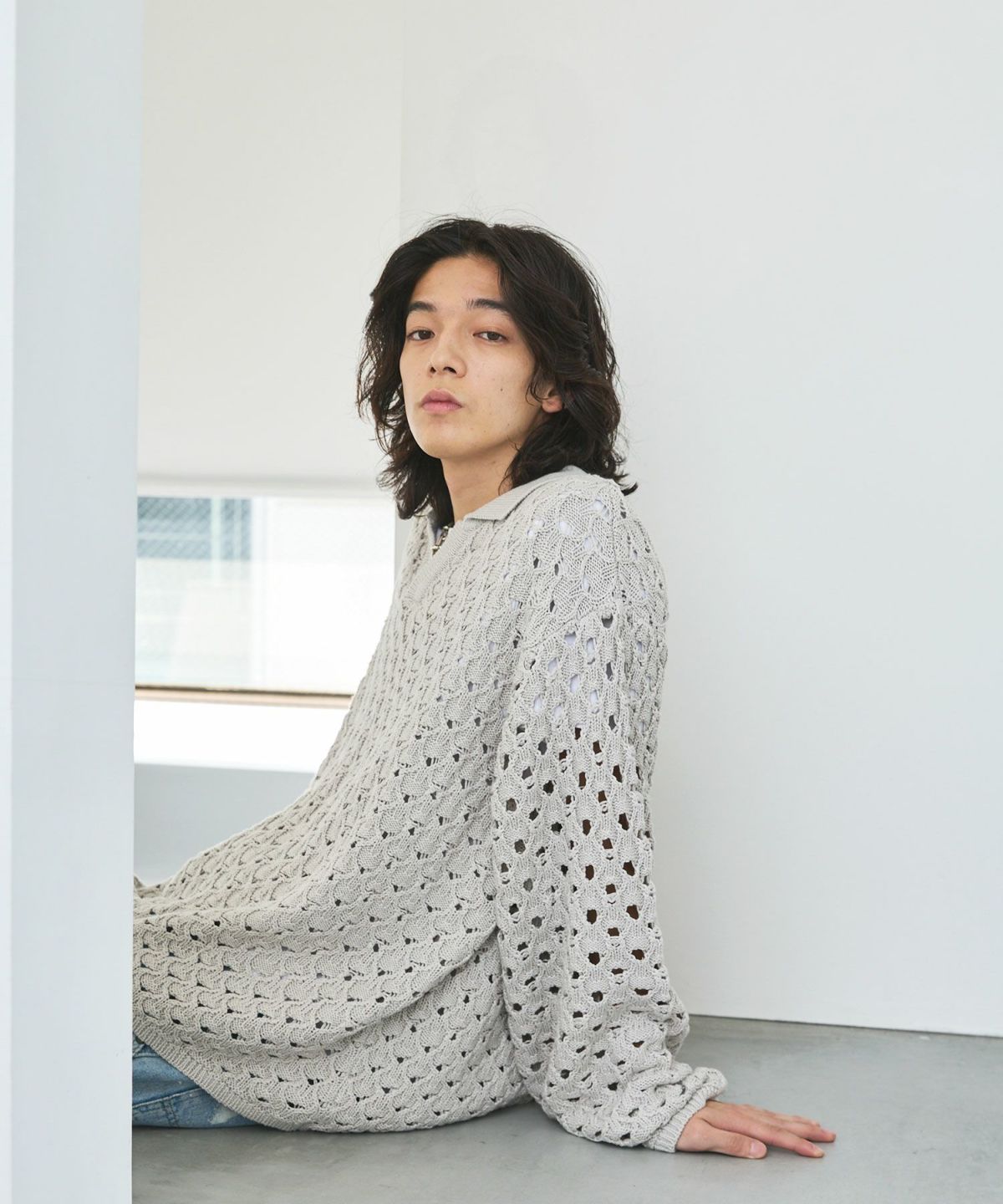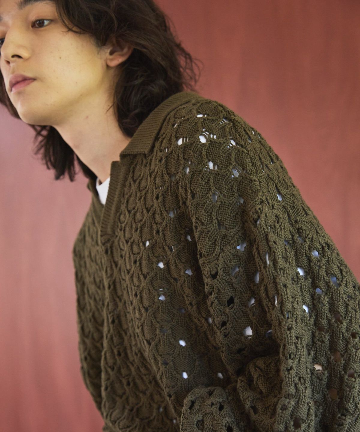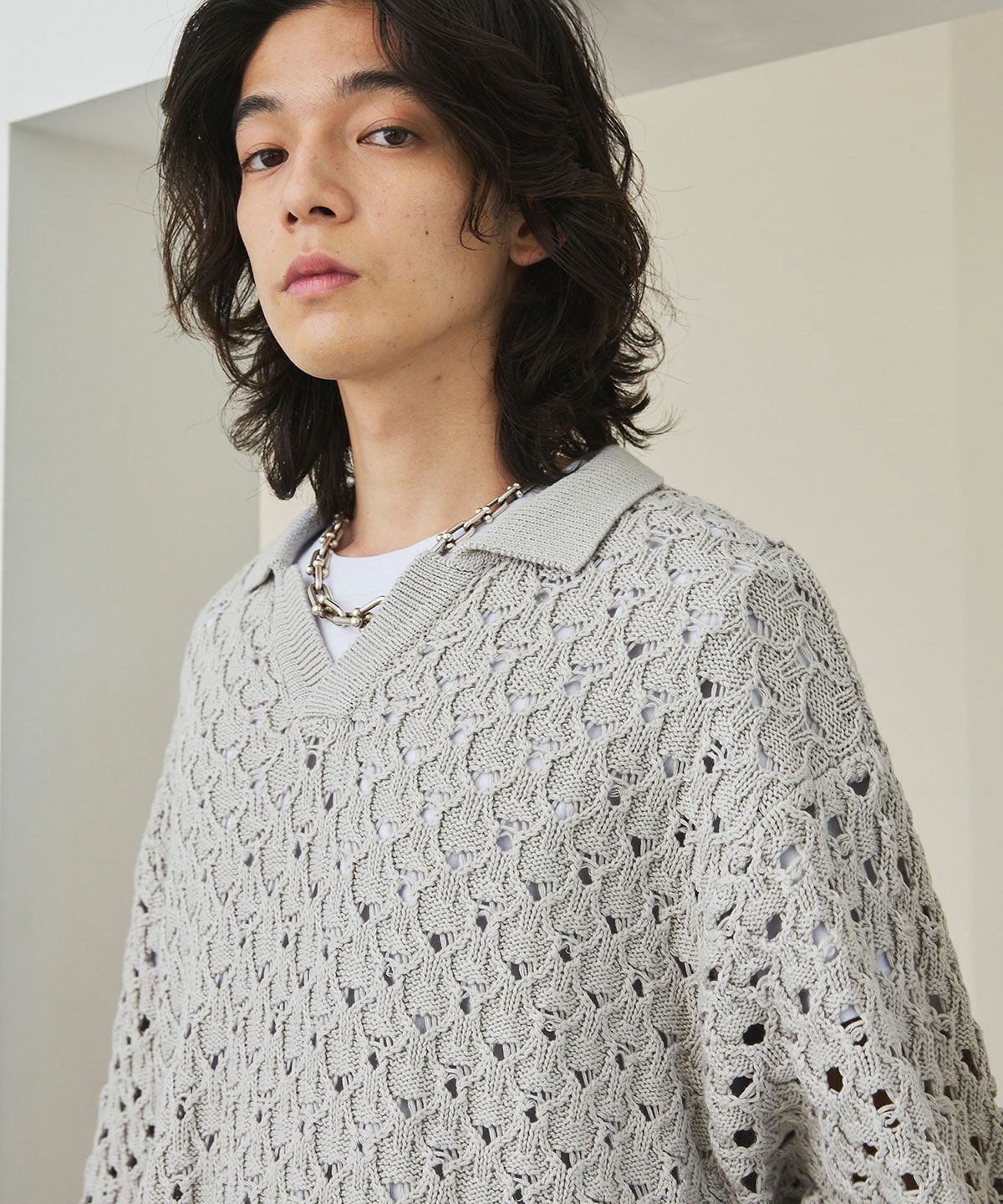 立体感のある編地に、程良いメッシュ感のあるオリジナルの編地で表現したこちらのポロニット。