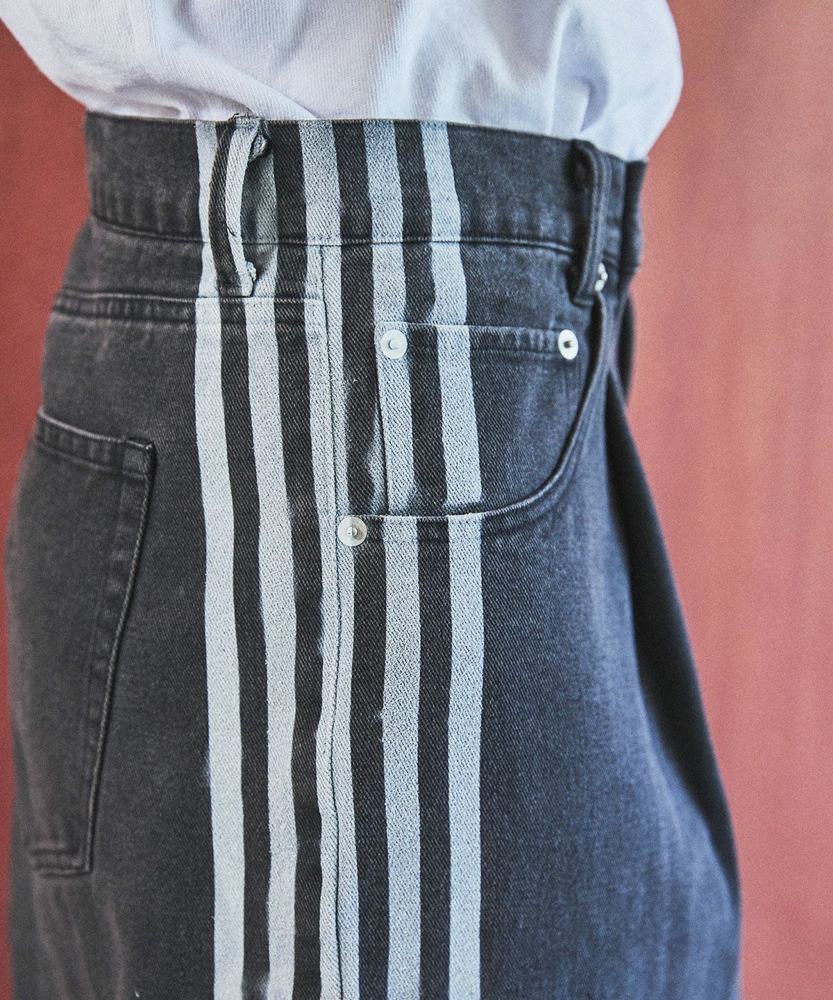 元々古着のリメイクアイテムとして展開されていたアイテムを今回OPENING ACTでバギーデニムを作成し、今回のコラボでサイドラインデザインを施して頂きました。