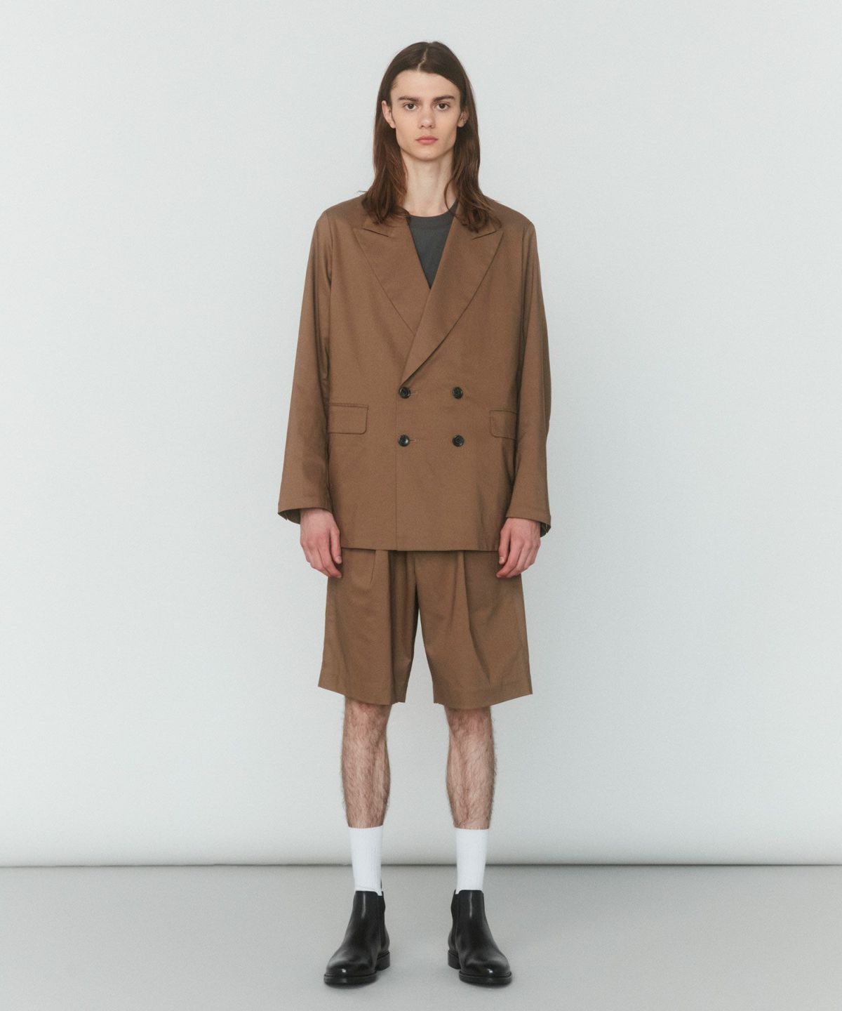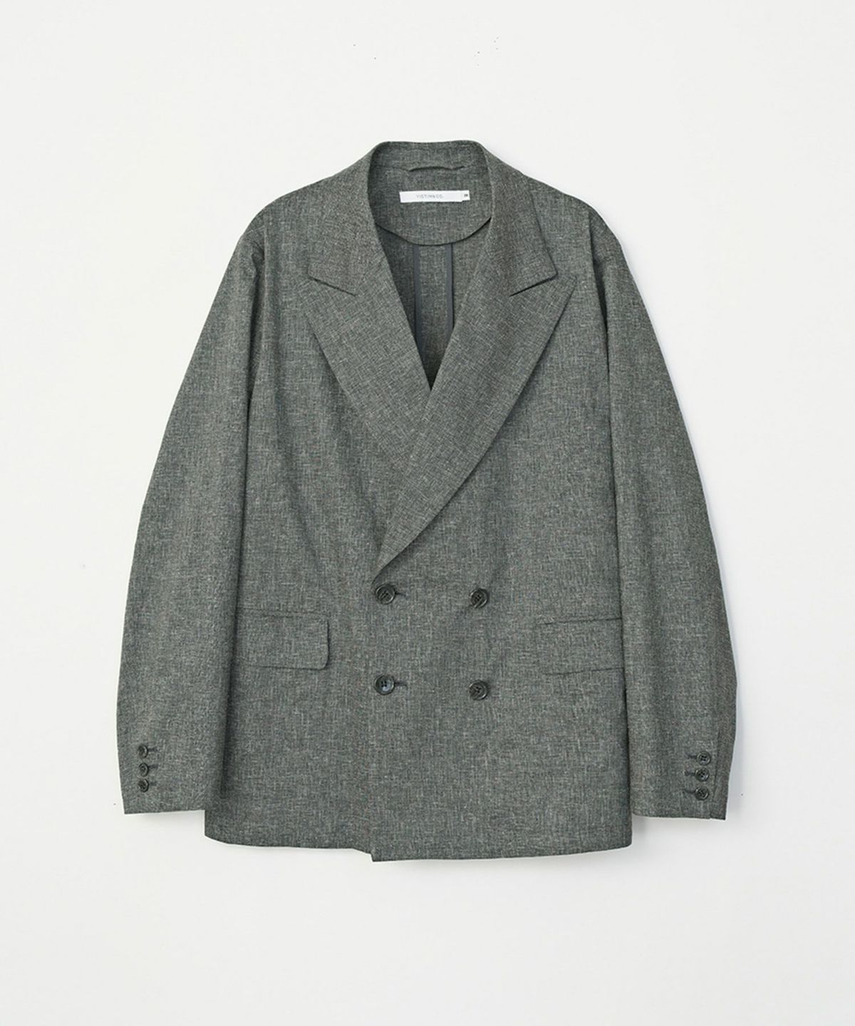 リネン特有のシャリ感を残しつつ、シワになりにくい生地を採用したダブルテーラードジャケット。
