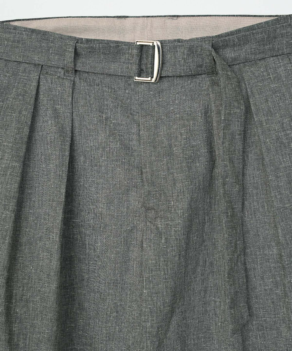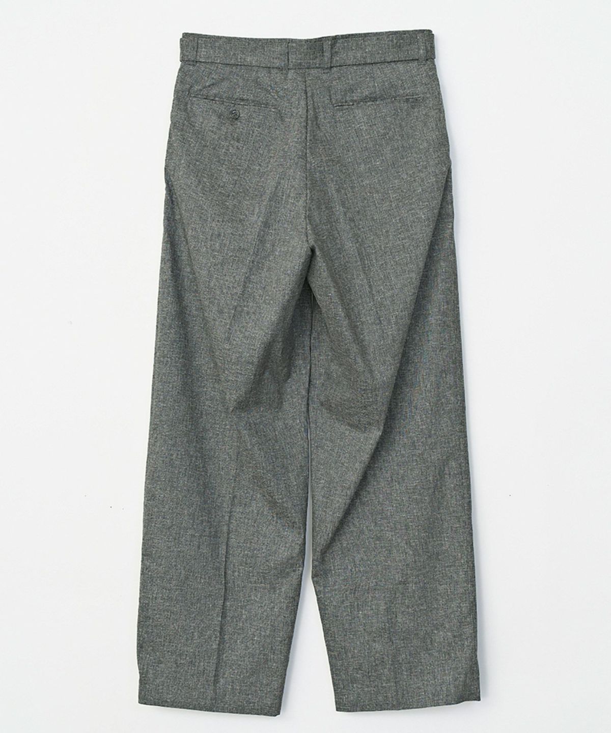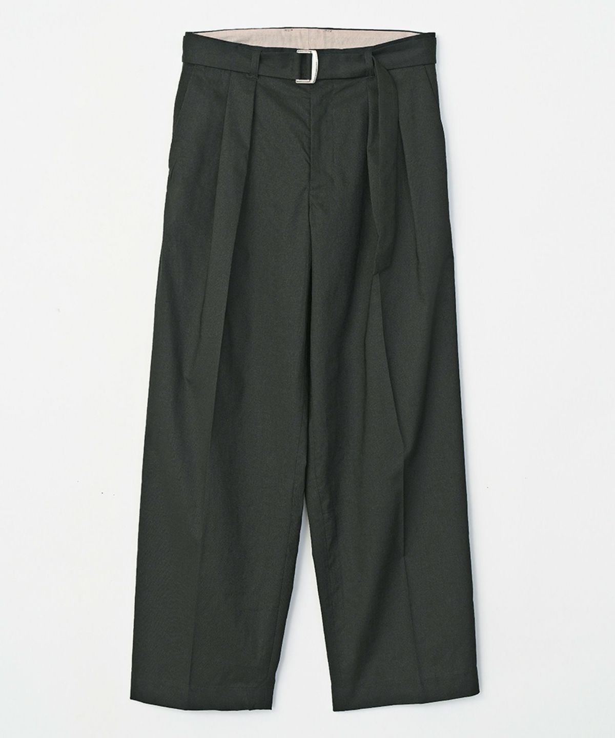リネンミックス素材でシャリ感を感じる快適に穿ける1本。 家庭でのケアも簡単なイージーケア仕様のバギースラックス。 同素材のベルト付きで、ウエスト周りに変化を与えてくれる1本です。 同素材のダブルテーラードジャケットとシャツとのセットアップでの着用も可能です。