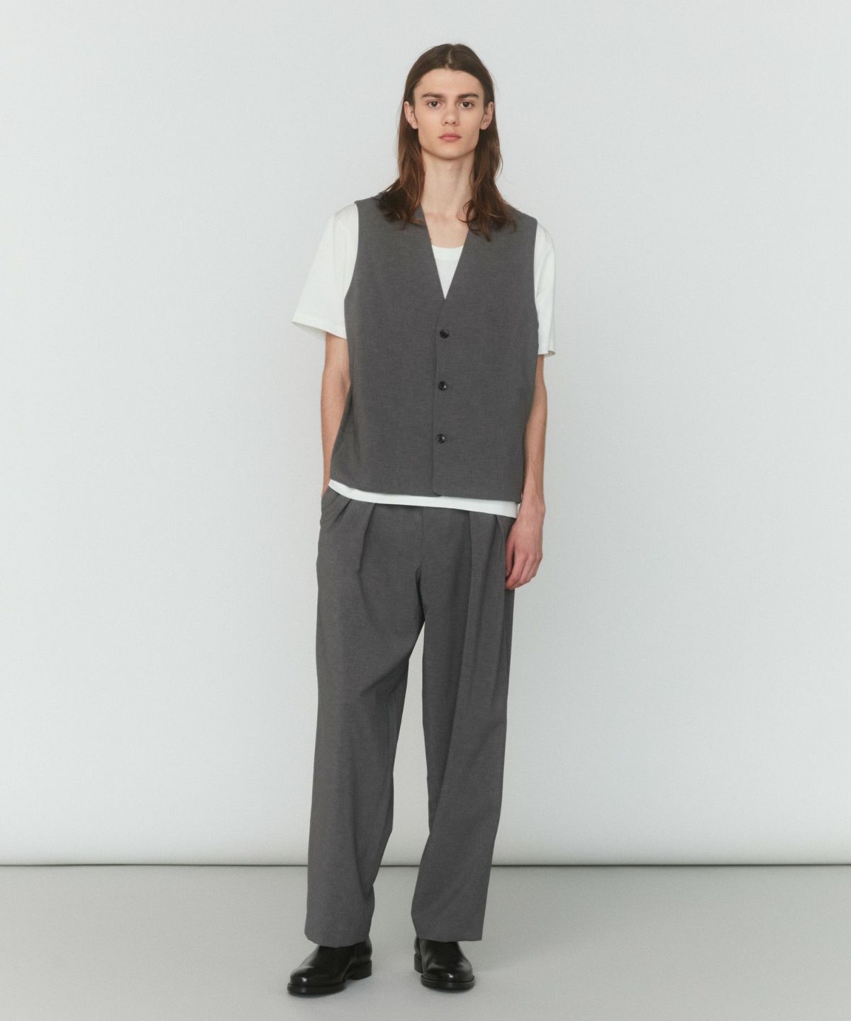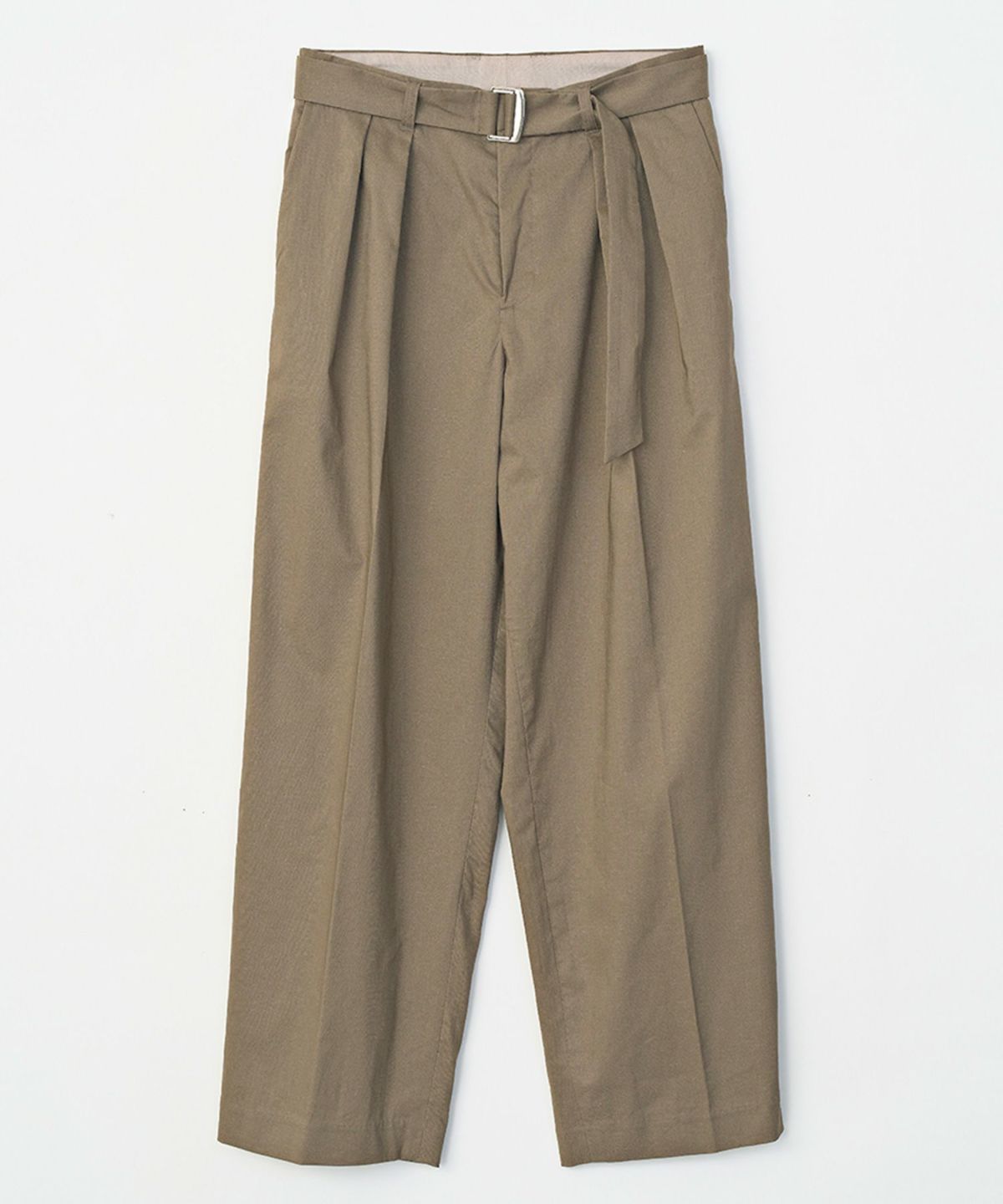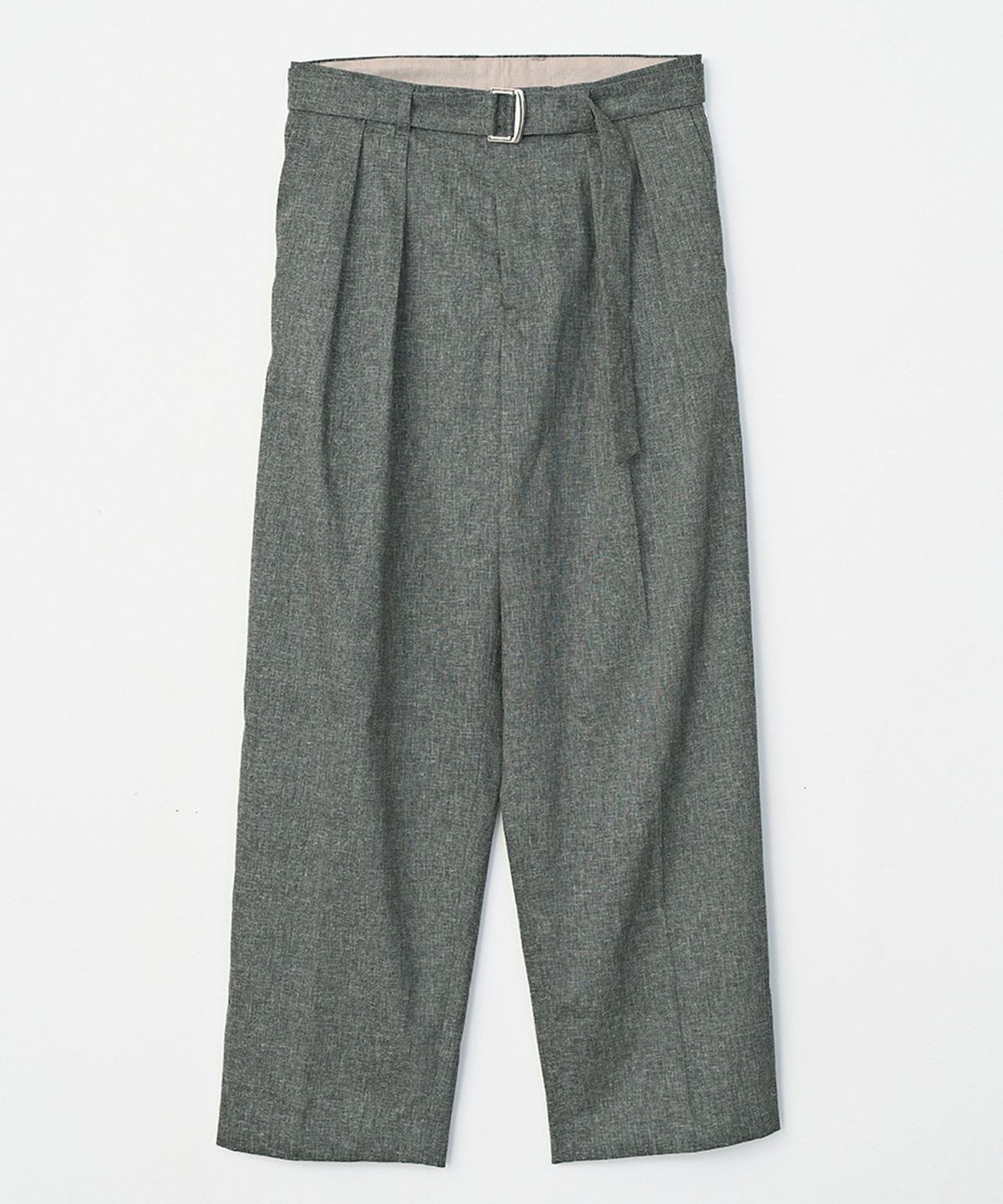 リネンミックス素材でシャリ感を感じる快適に穿ける1本。 家庭でのケアも簡単なイージーケア仕様のバギースラックス。 同素材のベルト付きで、ウエスト周りに変化を与えてくれる1本です。 同素材のダブルテーラードジャケットとシャツとのセットアップでの着用も可能です。