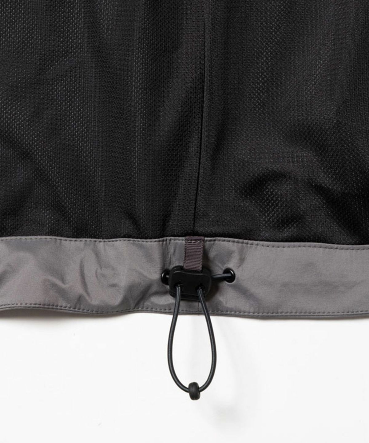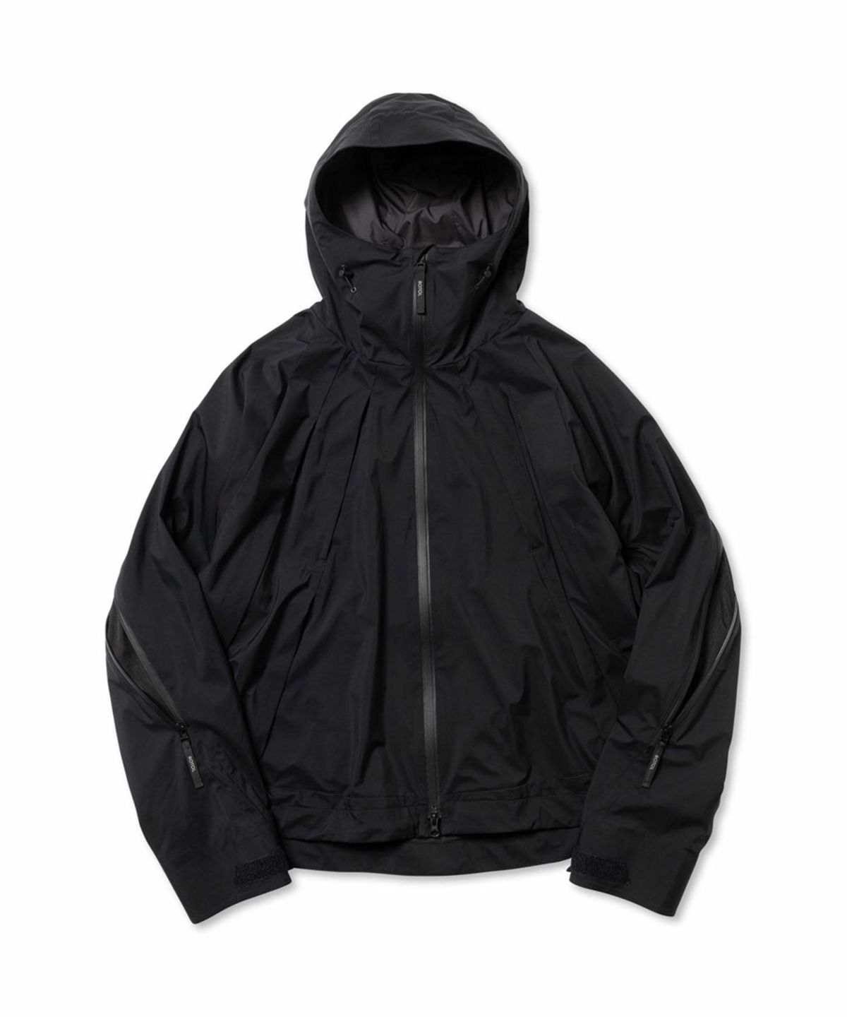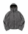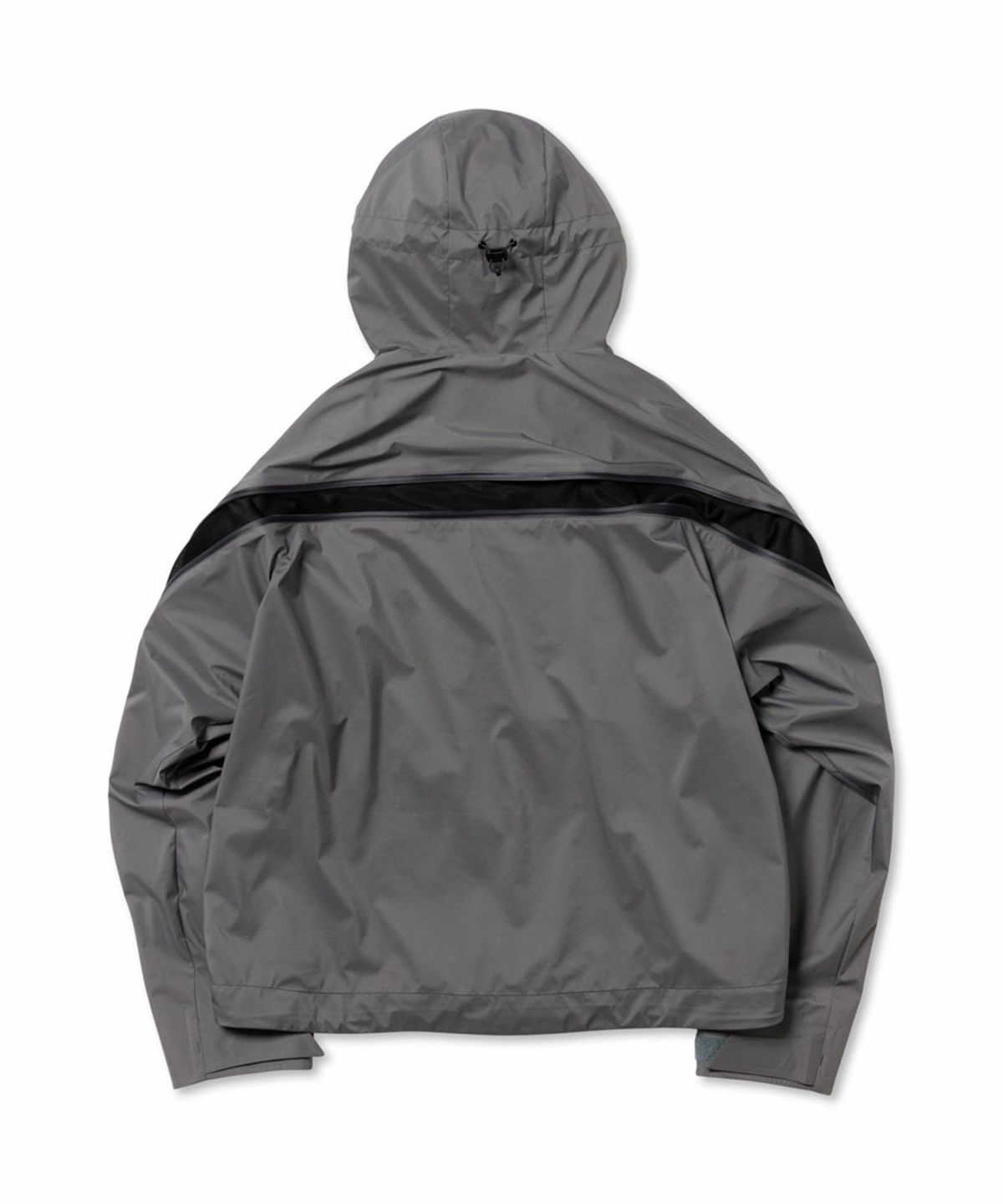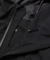透湿防水機能に優れたナイロンを使用したシェルパーカ。 背中のジップは開閉することでシルエットを変化させるだけでなく、内素材にメッシュを配したことでベンチレーションとしての機能も備えている。 フードはフィット感を高めるため、顔周りに二種類のドローコードを搭載。 フロントには合計6箇所のジップポケットを配しており、背面と同様にベンチレーションとしても機能する。 袖口はベルクロ、裾にはシルエットを調節するためのドローコードを採用。