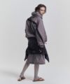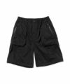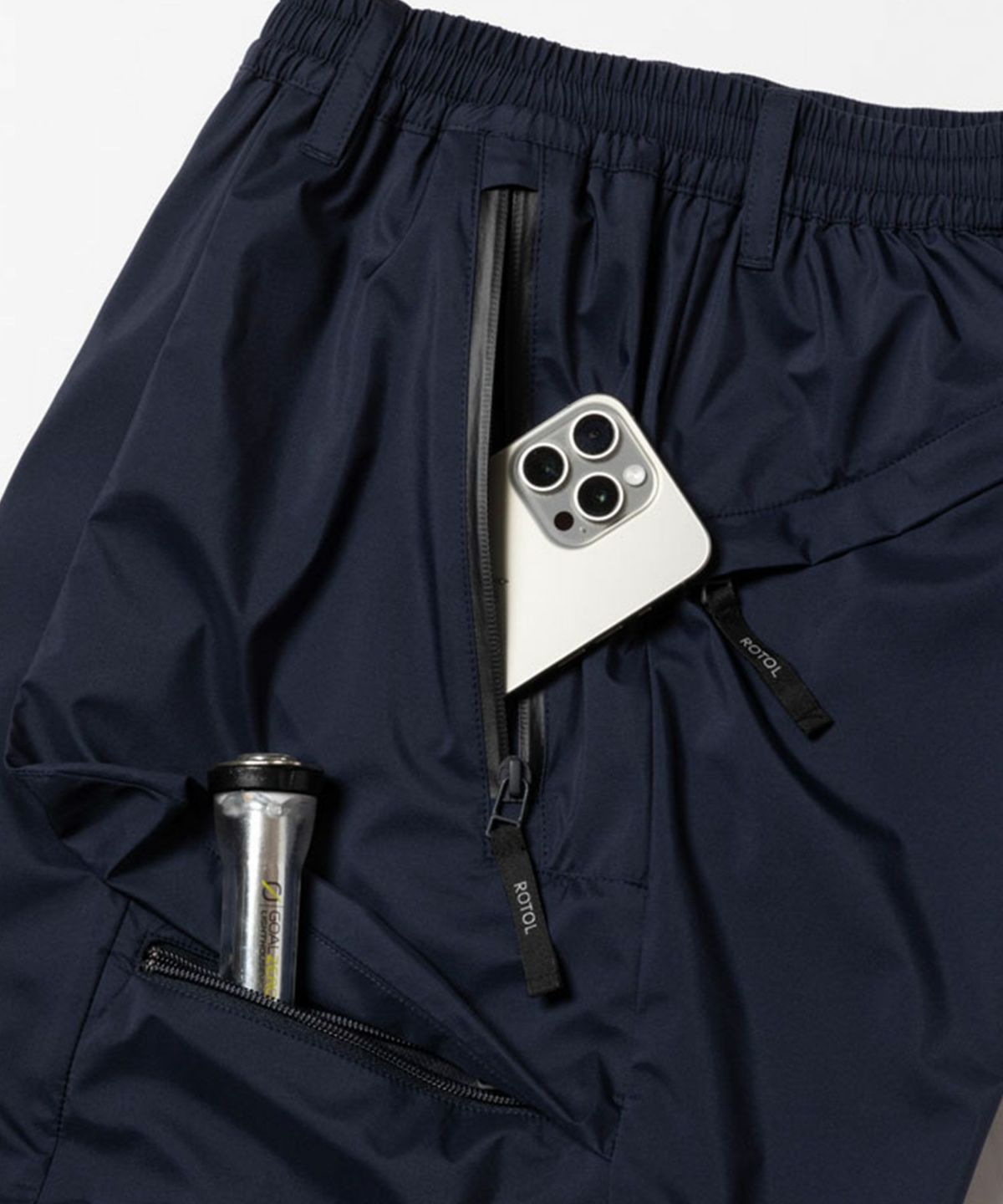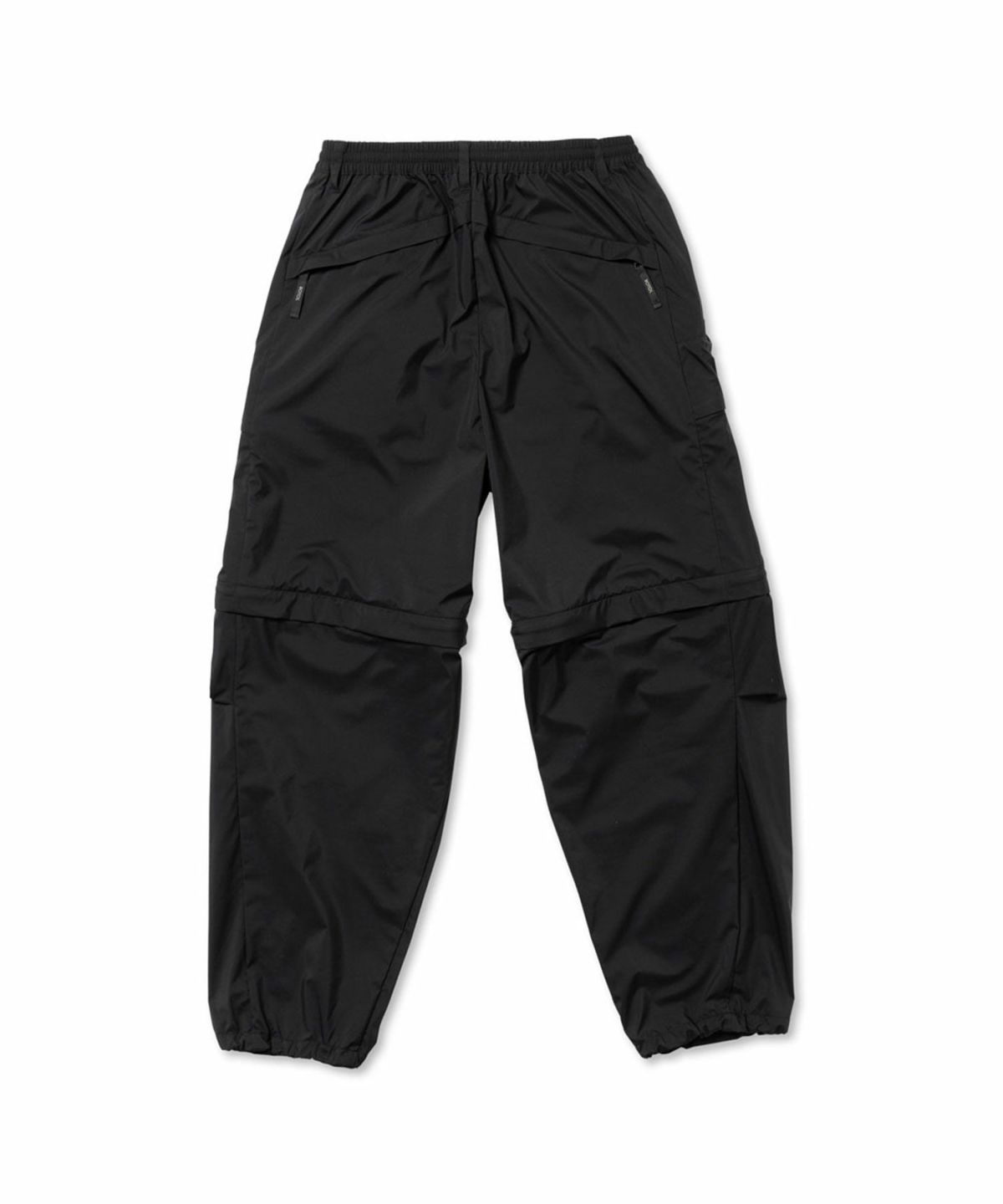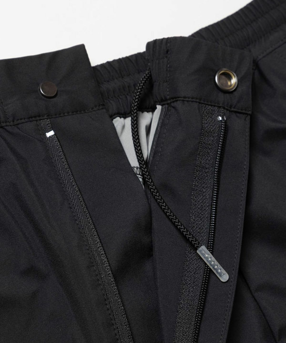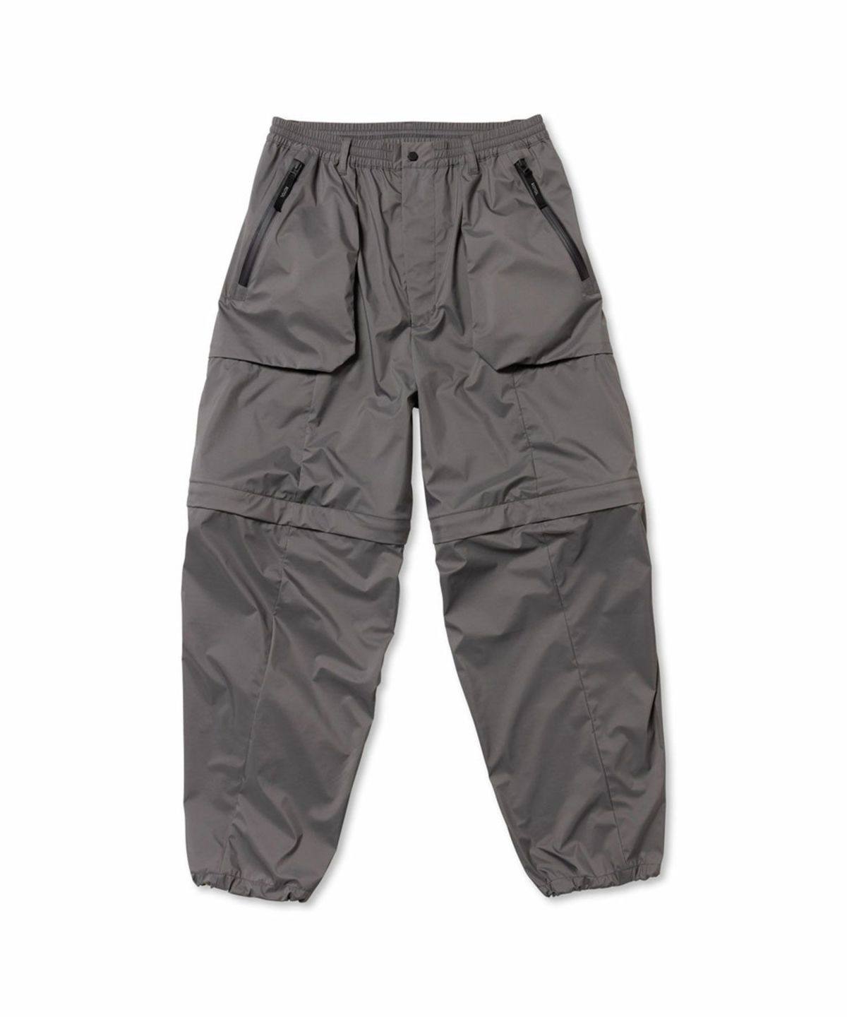透湿/防水機能に優れたナイロン素材のシェルカーゴパンツ。 膝にかけて広がるダイアモンドシルエット。ウエストにはゴムと紐、さらにベルトループを配し、前開きは脱着のしやすいジップとドットボタンを使用している。 裾にはシルエットを調節するためのドローコードを採用。 膝部分のジップによりショーツにも変化する2way仕様となっている。