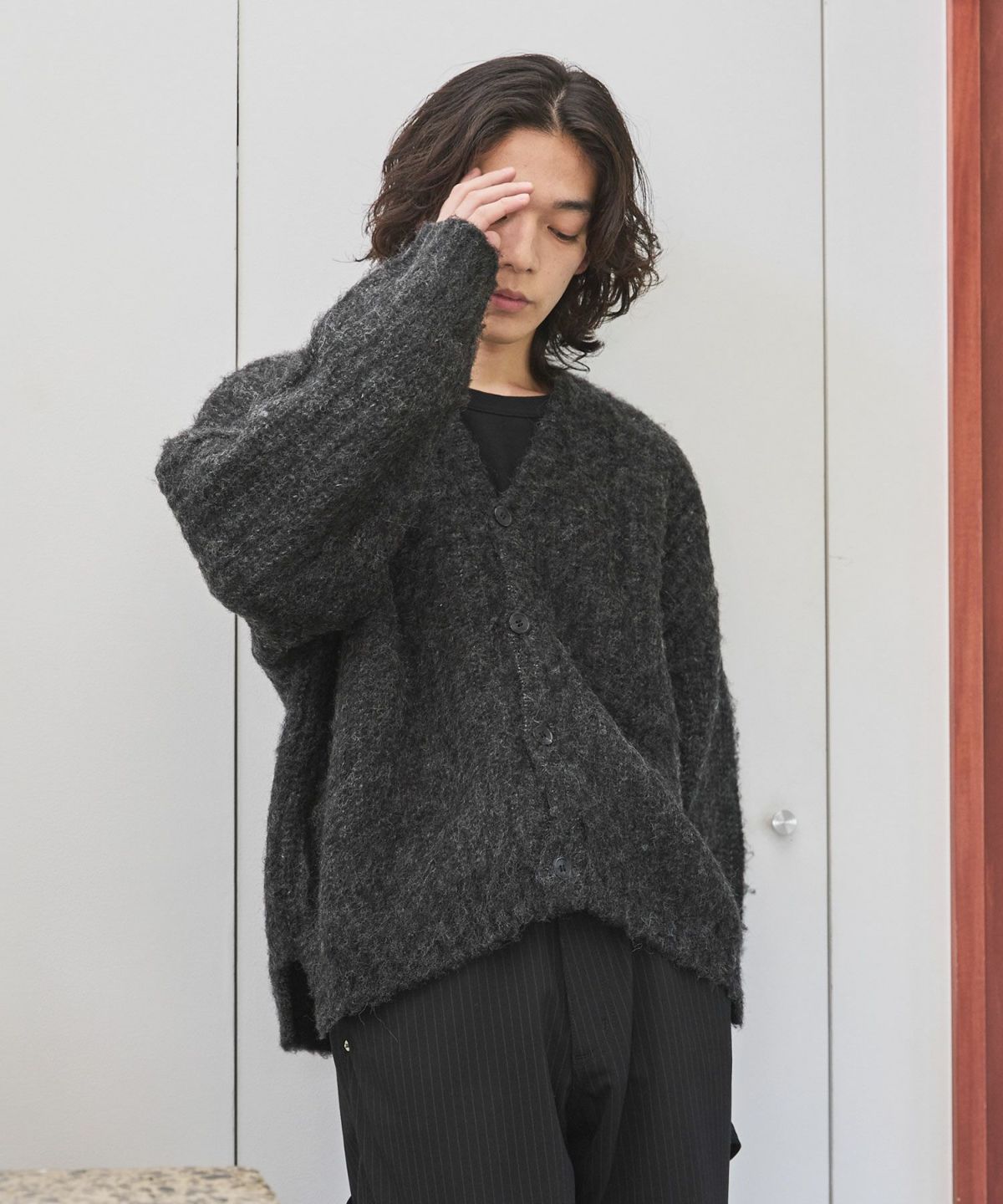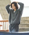 畔編みに編み上げたニットは、表面の立体感を演出し、またニット専門工場で仕上げた起毛加工により、