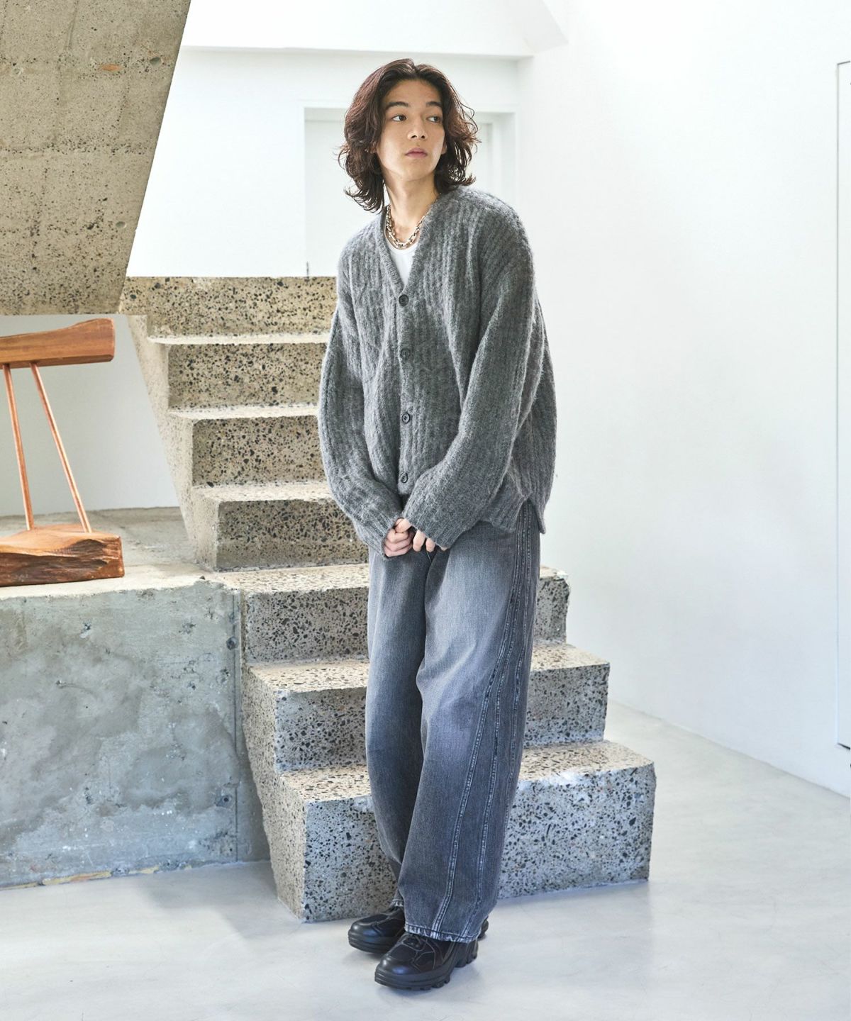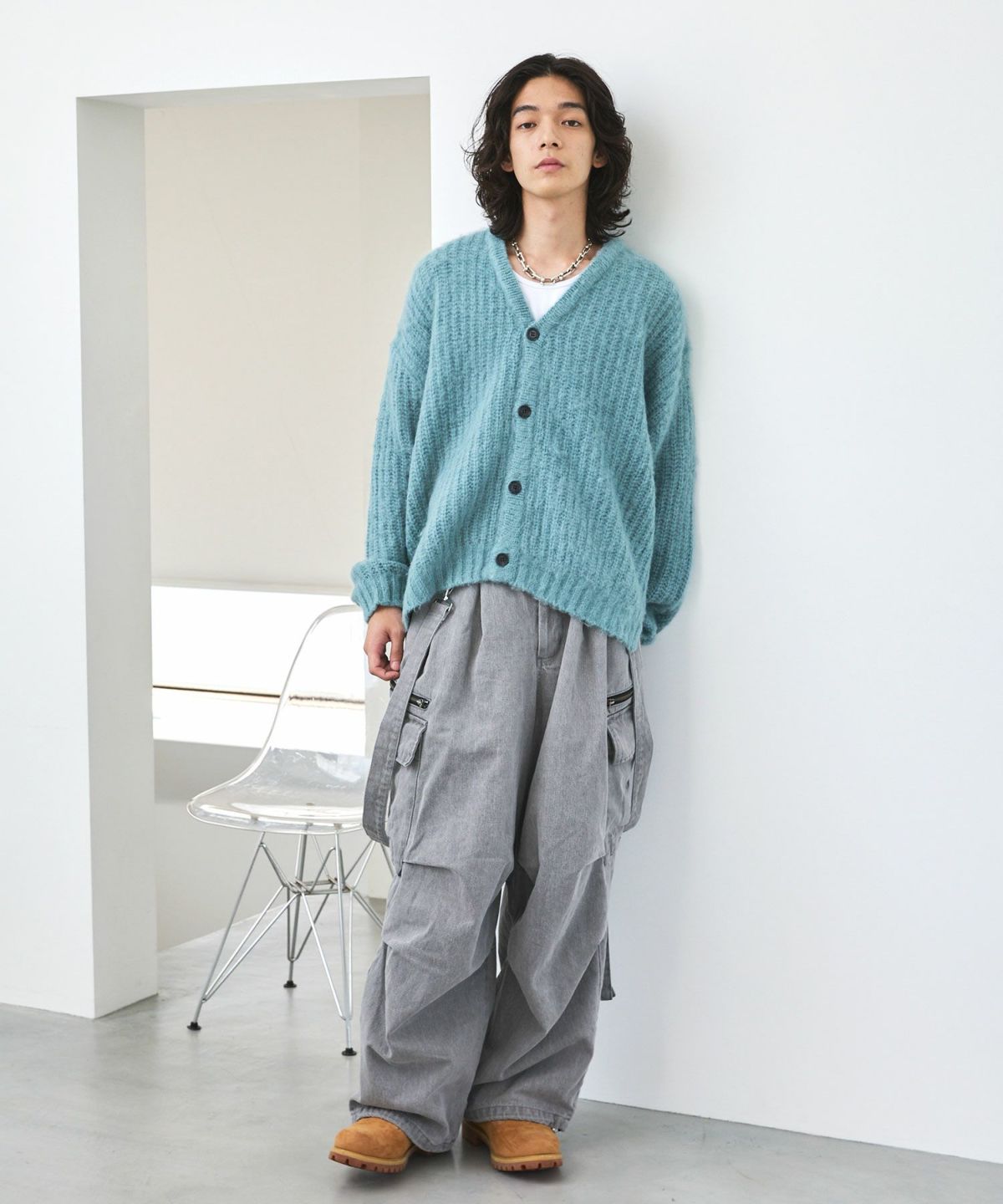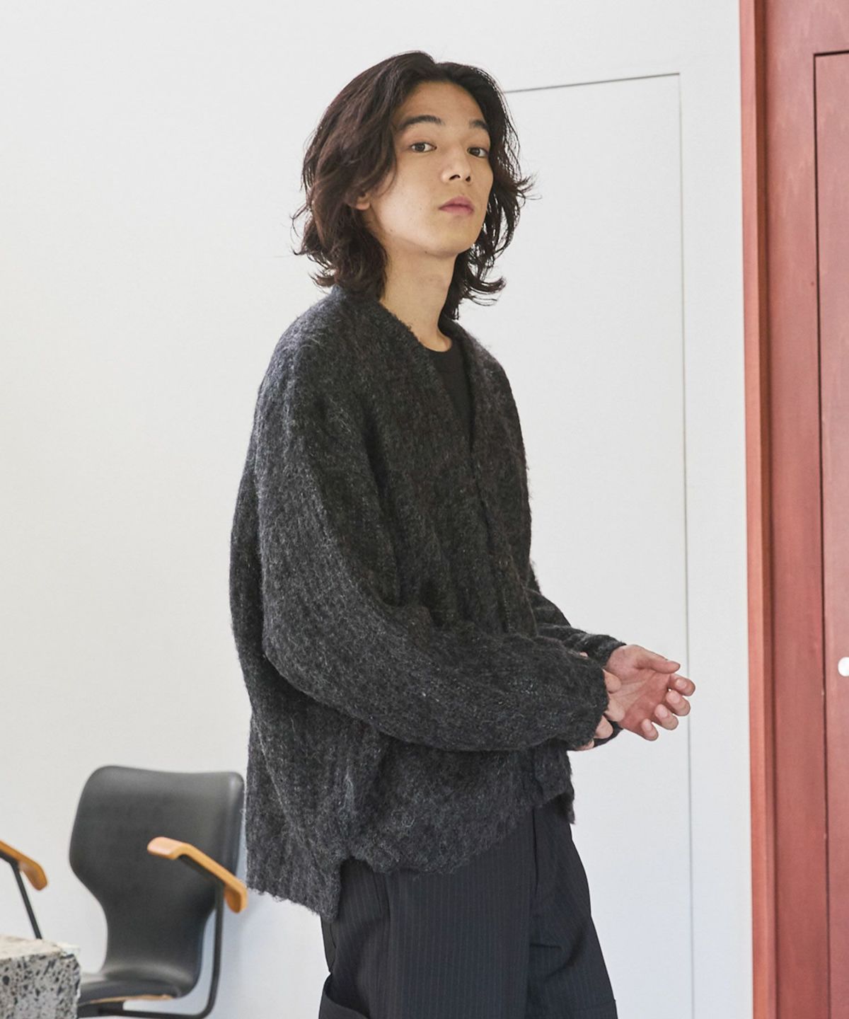 やや短めの着丈に設定することで、このアイテムを取り入れるだけで、新鮮なシルエットの着こなしが完成する事も魅力です。