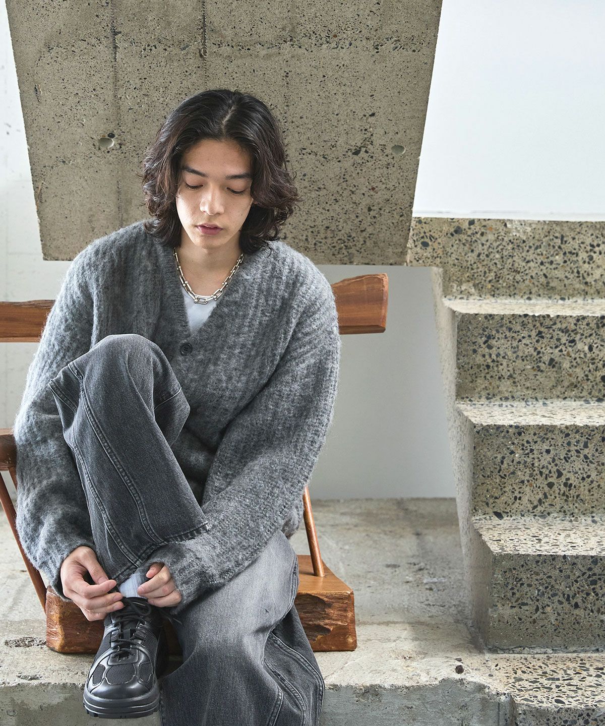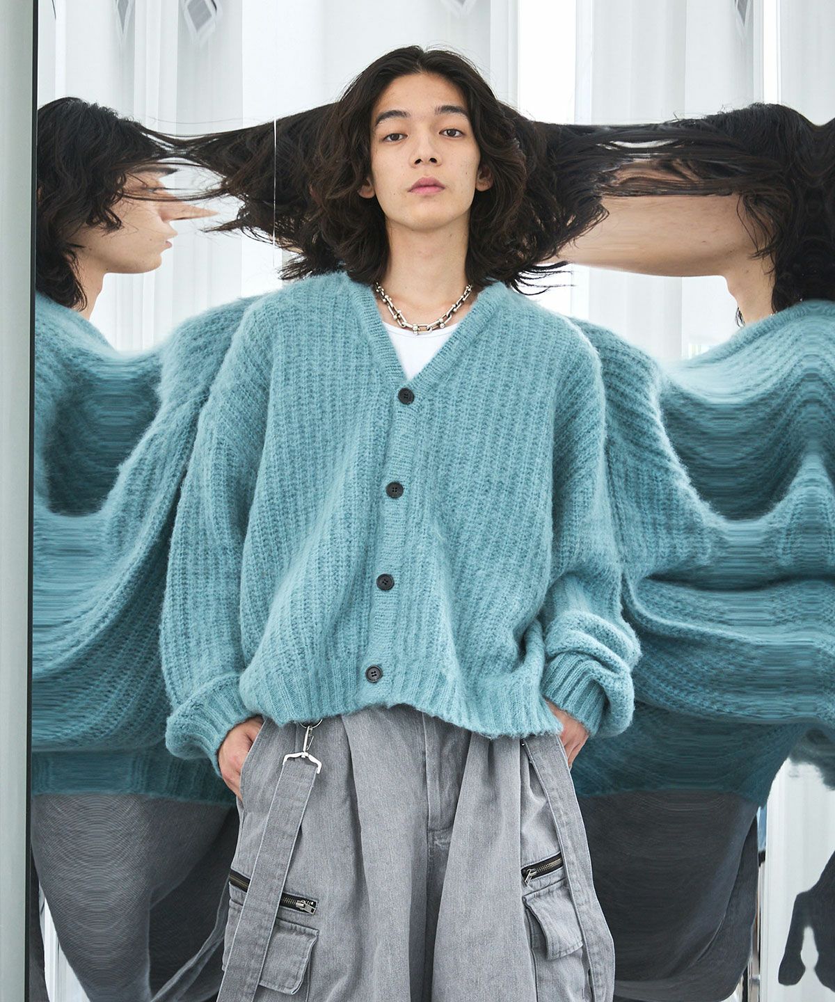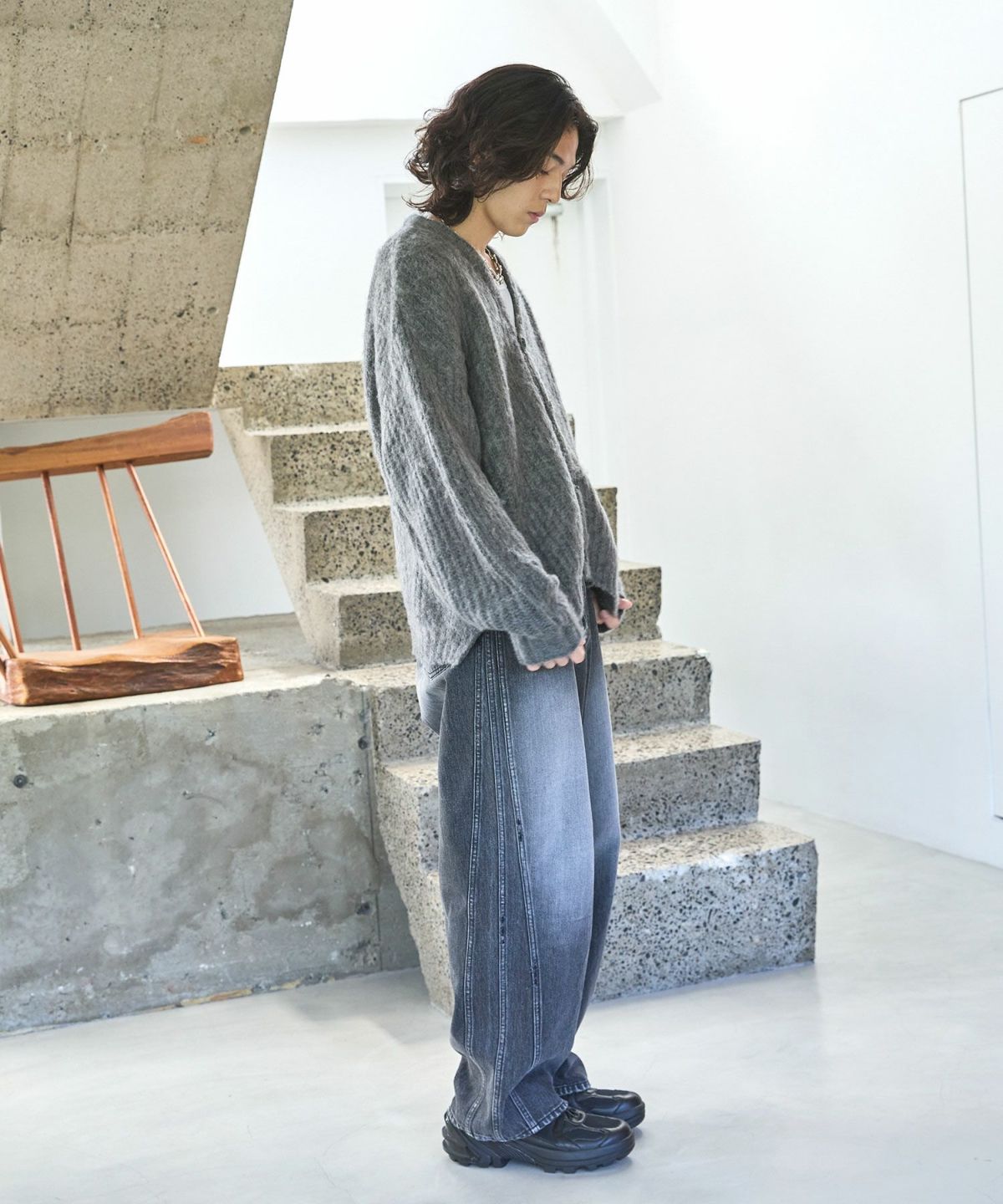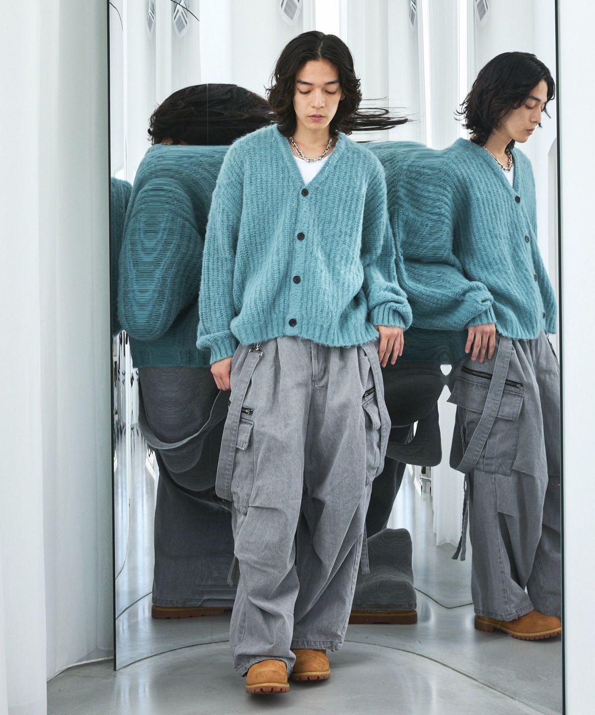 やや短めの着丈に設定することで、このアイテムを取り入れるだけで、新鮮なシルエットの着こなしが完成する事も魅力です。