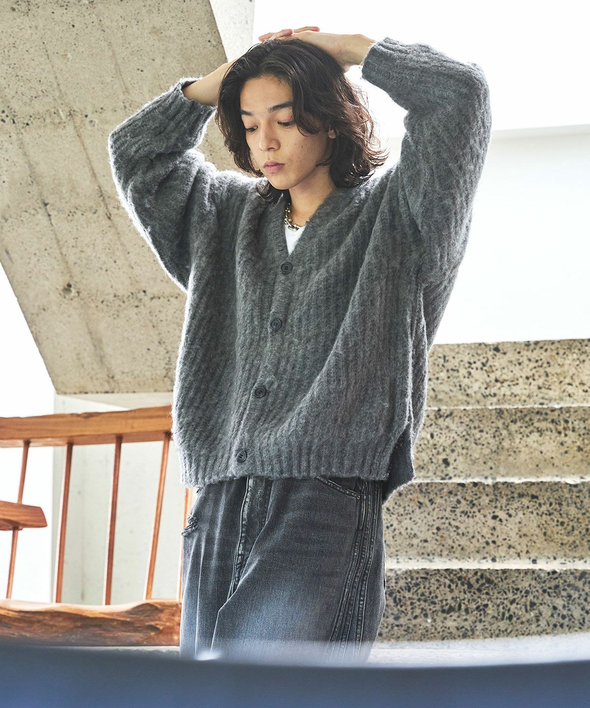 デザインとしては非常にシンプルかつ、ありそうだなかった胸元を浅くした仕様のVネックニットカーディガン。