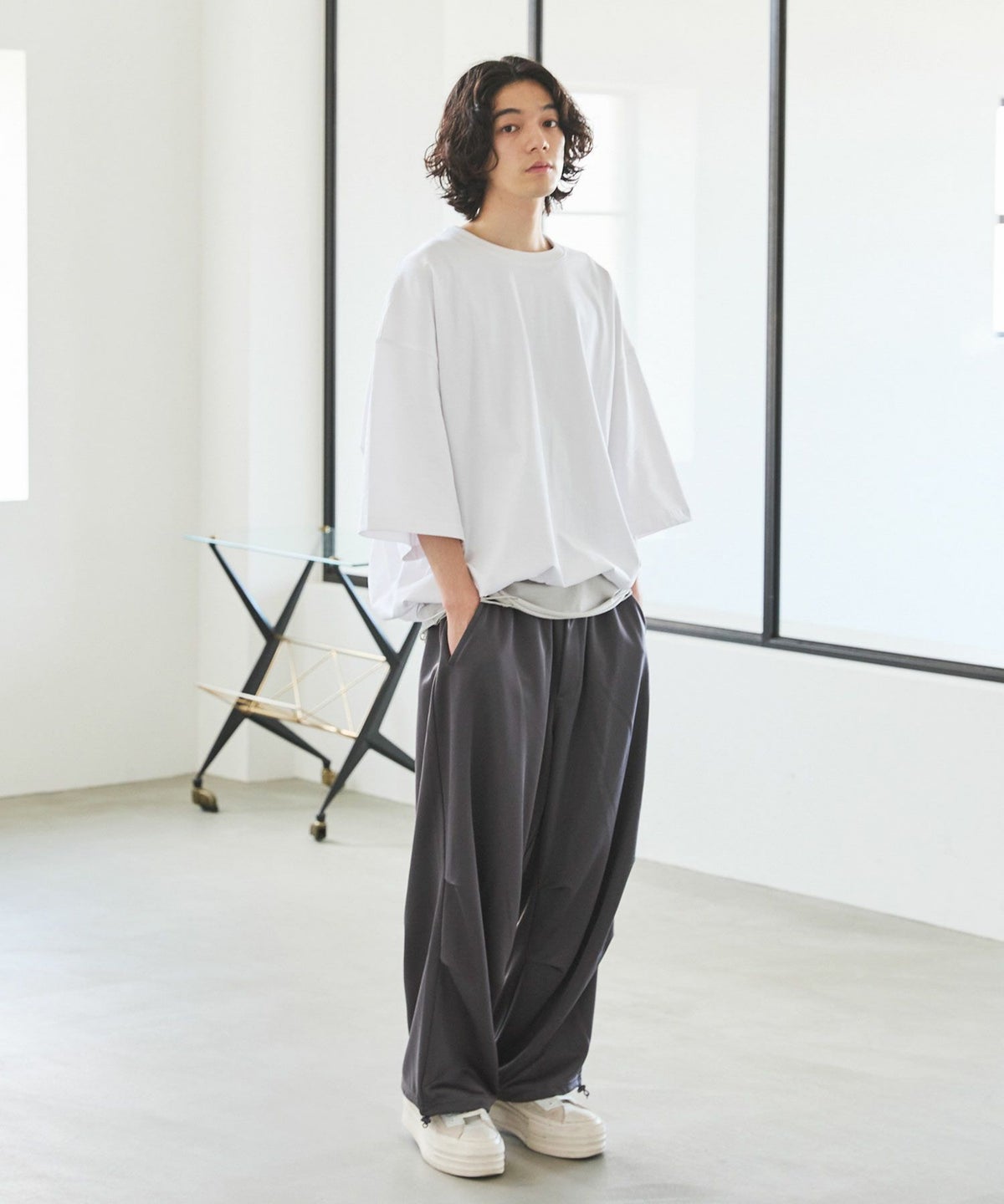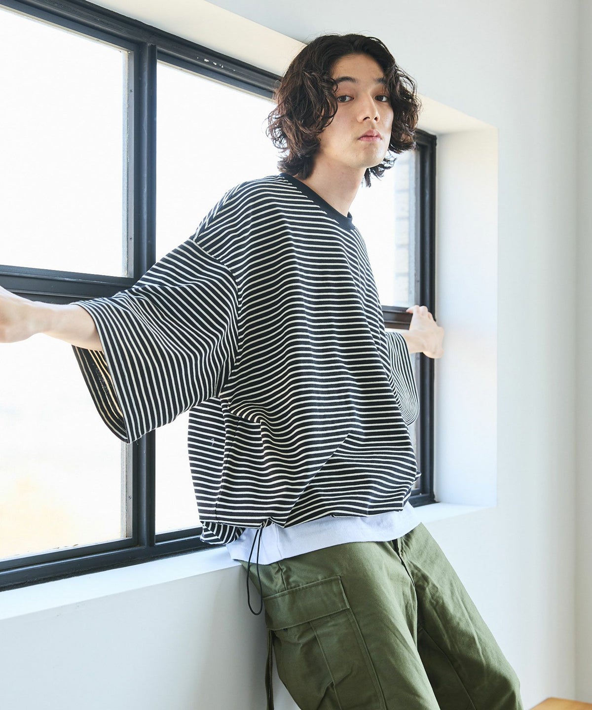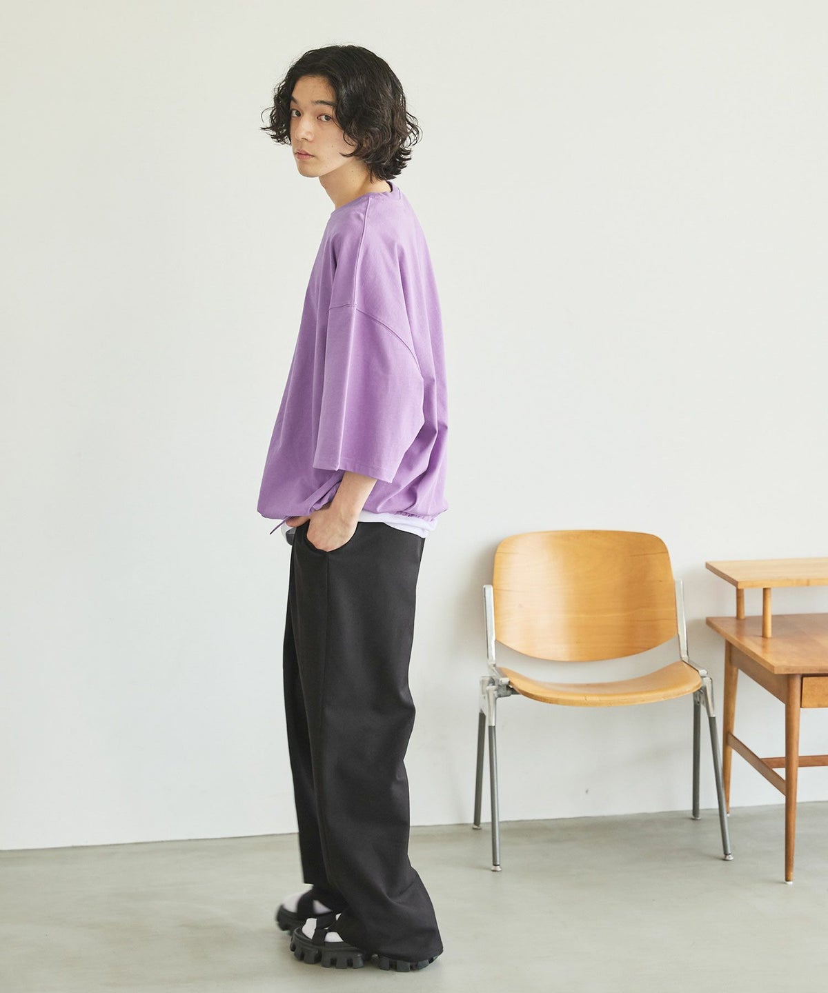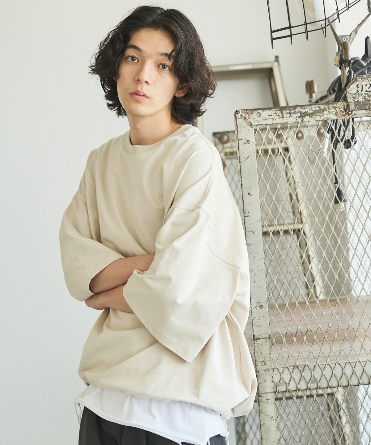 大胆にとったドロップショルダーシルエットで、まさに一枚で決まるカットソーです。