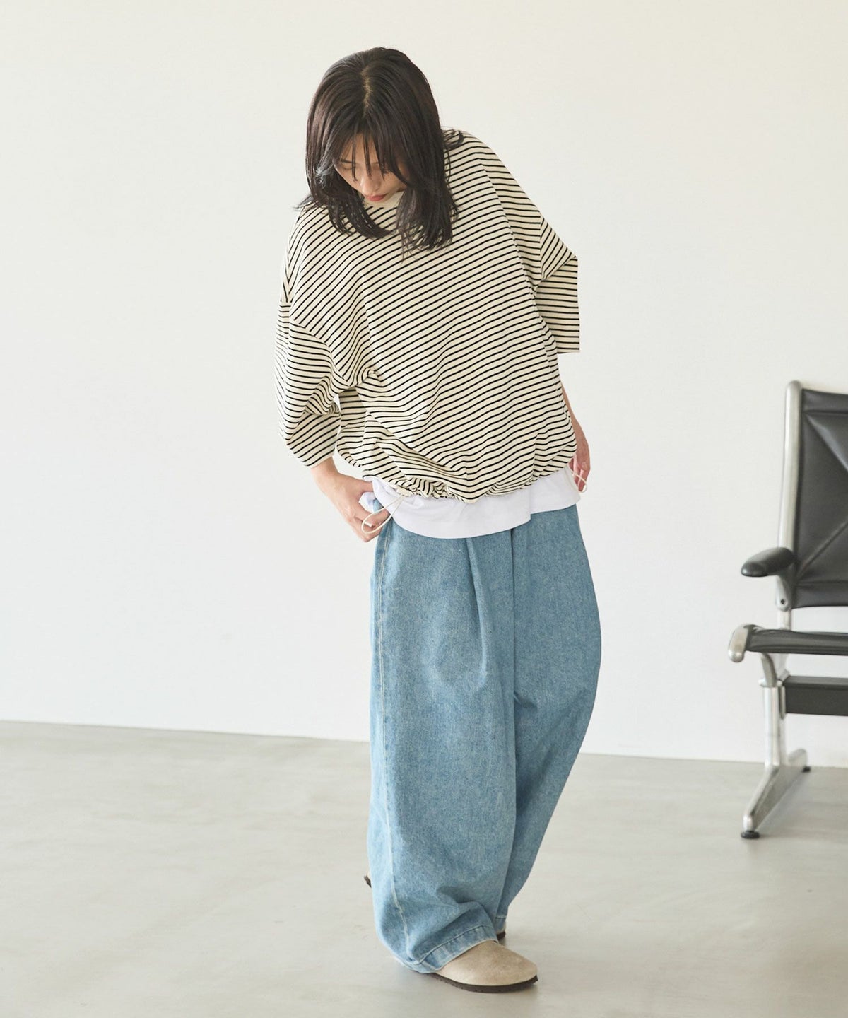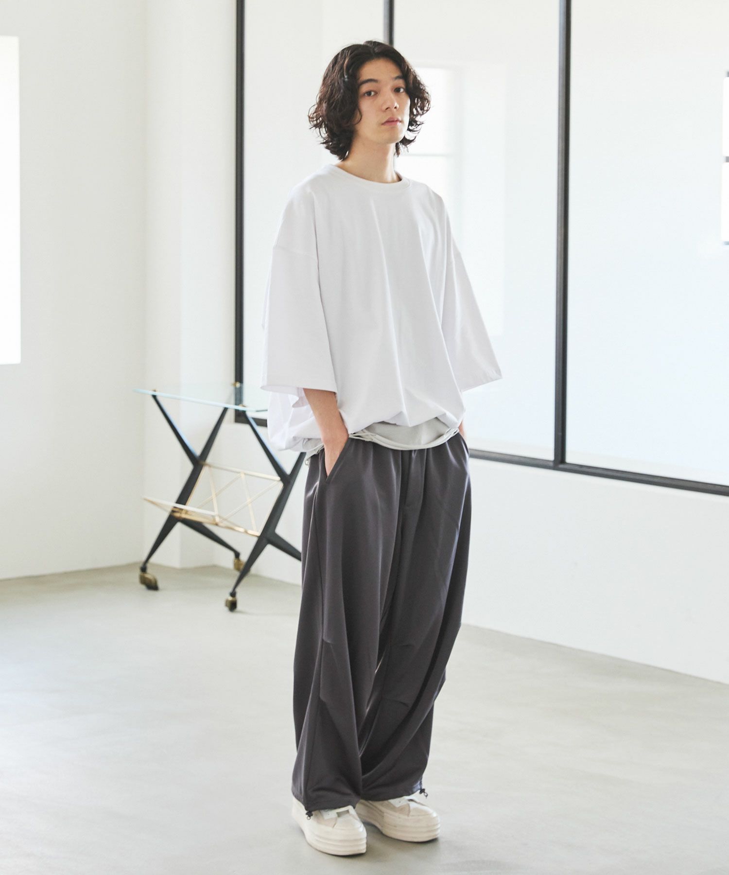 そのまま絞らず着る事も可能ですが、裾を絞る事で、シルエットを変更することが可能で、