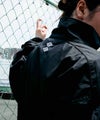 スポーツアイテムの定番アイテムであるハイネック仕様のトラックジャケットをベースとして作ったこちらのジャケット。