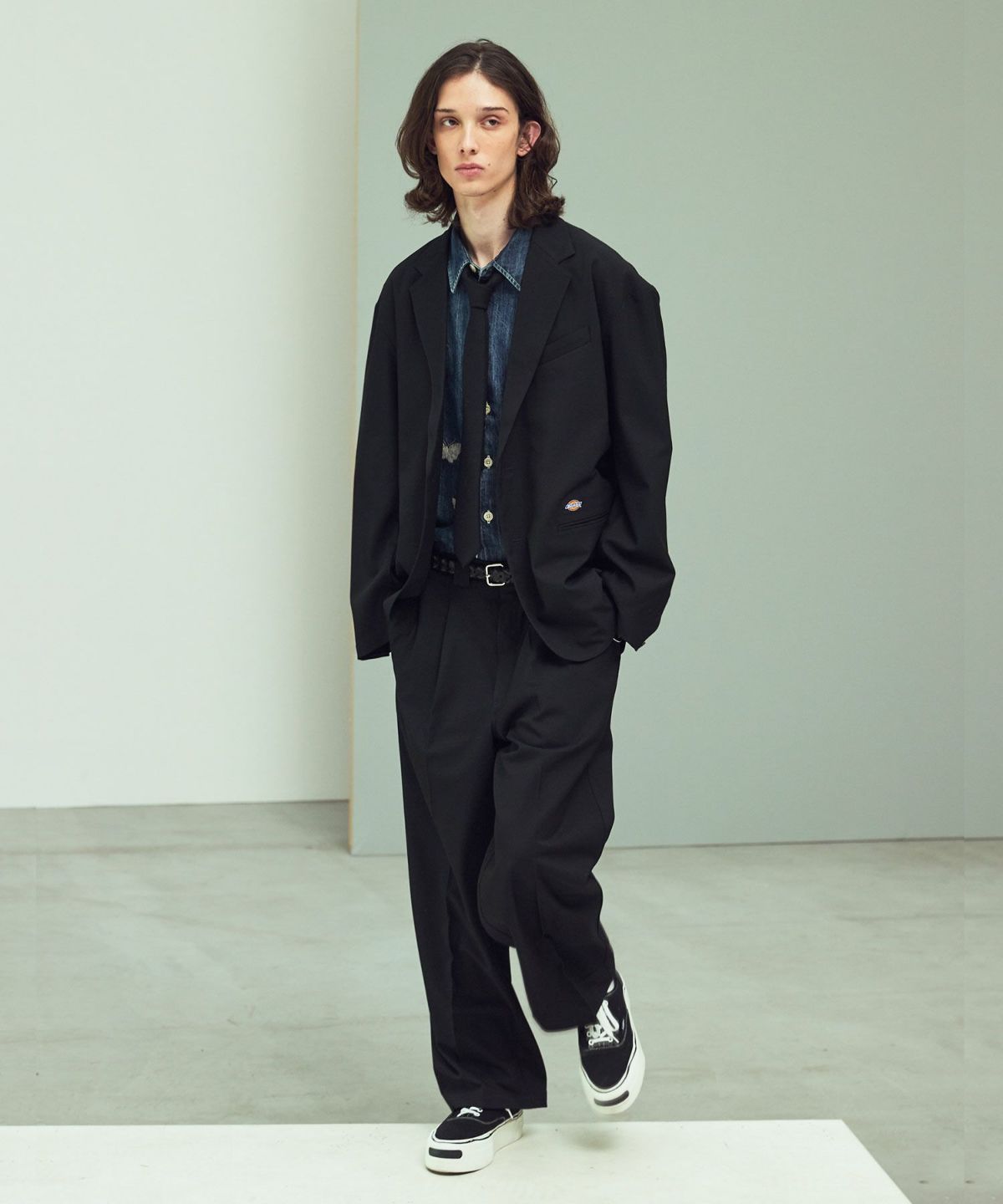 ディッキーズの定番生地であるコットンポリエステル生地の様なタフさと、スーツ生地の上品さの、どちらの表情も兼ね揃えたアイテムに仕上がりました。