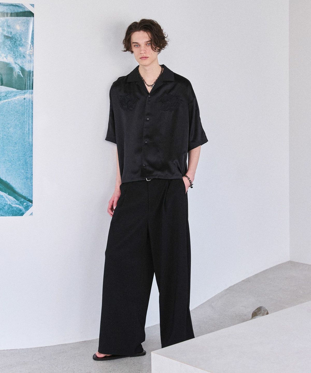 エクストラバギーシルエットとなっており、膝下に向けてテーパードさせずにストレートにすることで、 よりワイドなシルエットを体感出来、腰まわりのフロントには深く入った1タック仕様。