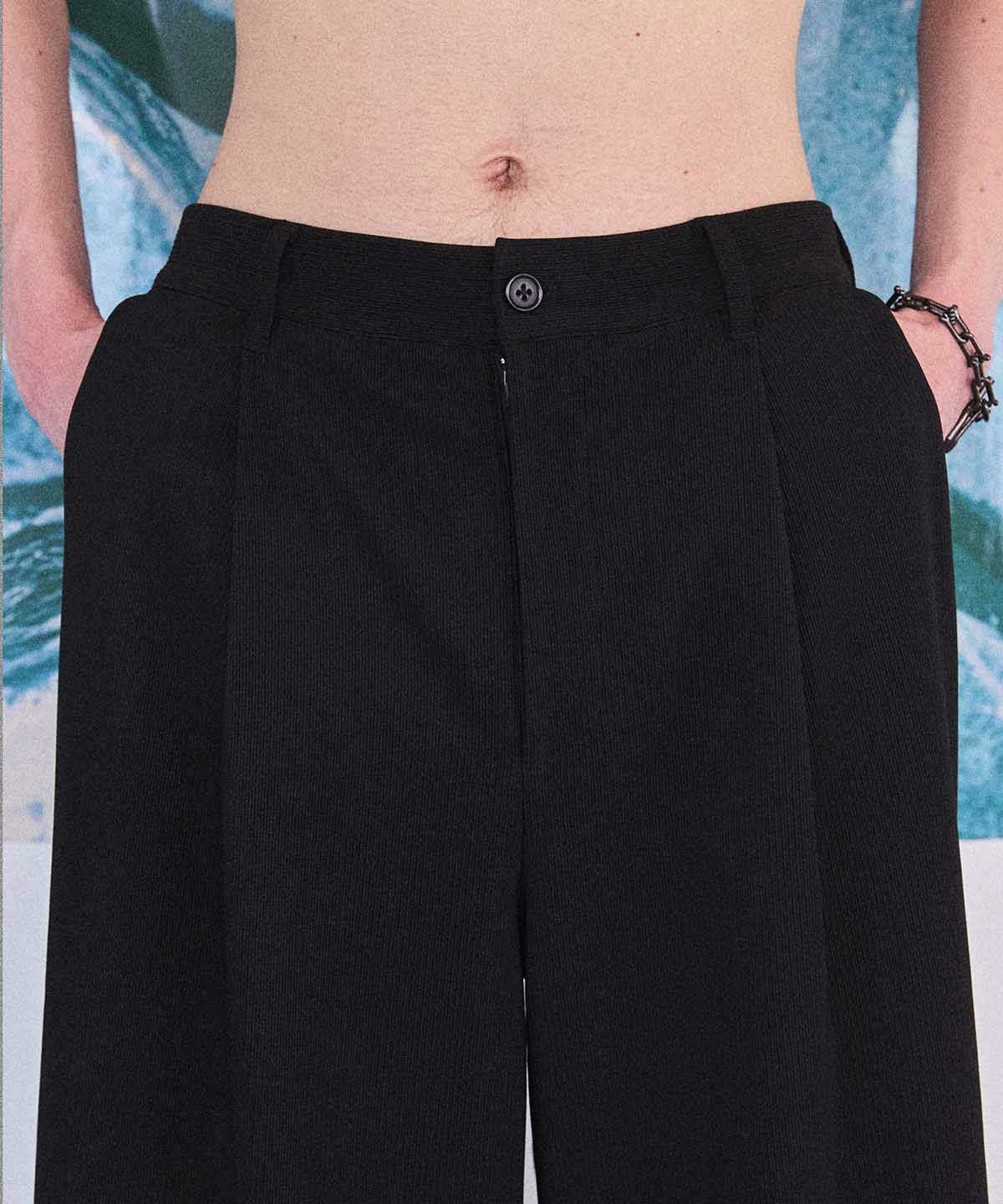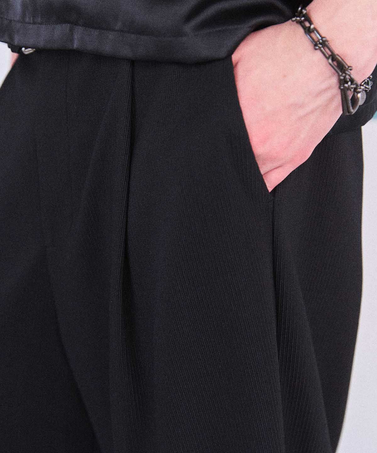 今回リリースのスラックスは市場で流通してるワイドパンツでは物足りない方に向けた、メリハリあるボリューム感あるワイドパンツにデザイン。