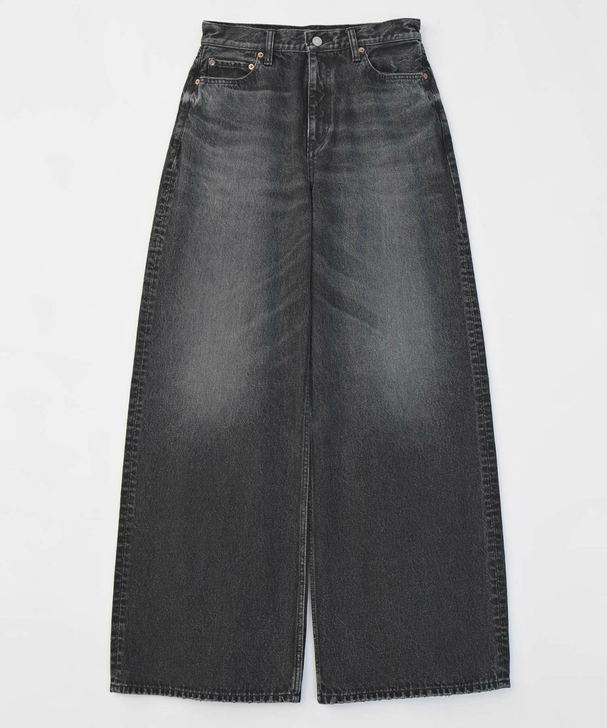 独特なバギーシルエットと裾に向かって広がるデザインが特徴で、シンプルなコーディネートに合わせても強いインパクトを与えるアイテムです。