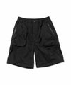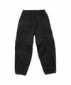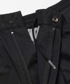透湿/防水機能に優れたナイロン素材のシェルカーゴパンツ。 膝にかけて広がるダイアモンドシルエット。ウエストにはゴムと紐、さらにベルトループを配し、前開きは脱着のしやすいジップとドットボタンを使用している。 裾にはシルエットを調節するためのドローコードを採用。 膝部分のジップによりショーツにも変化する2way仕様となっている。