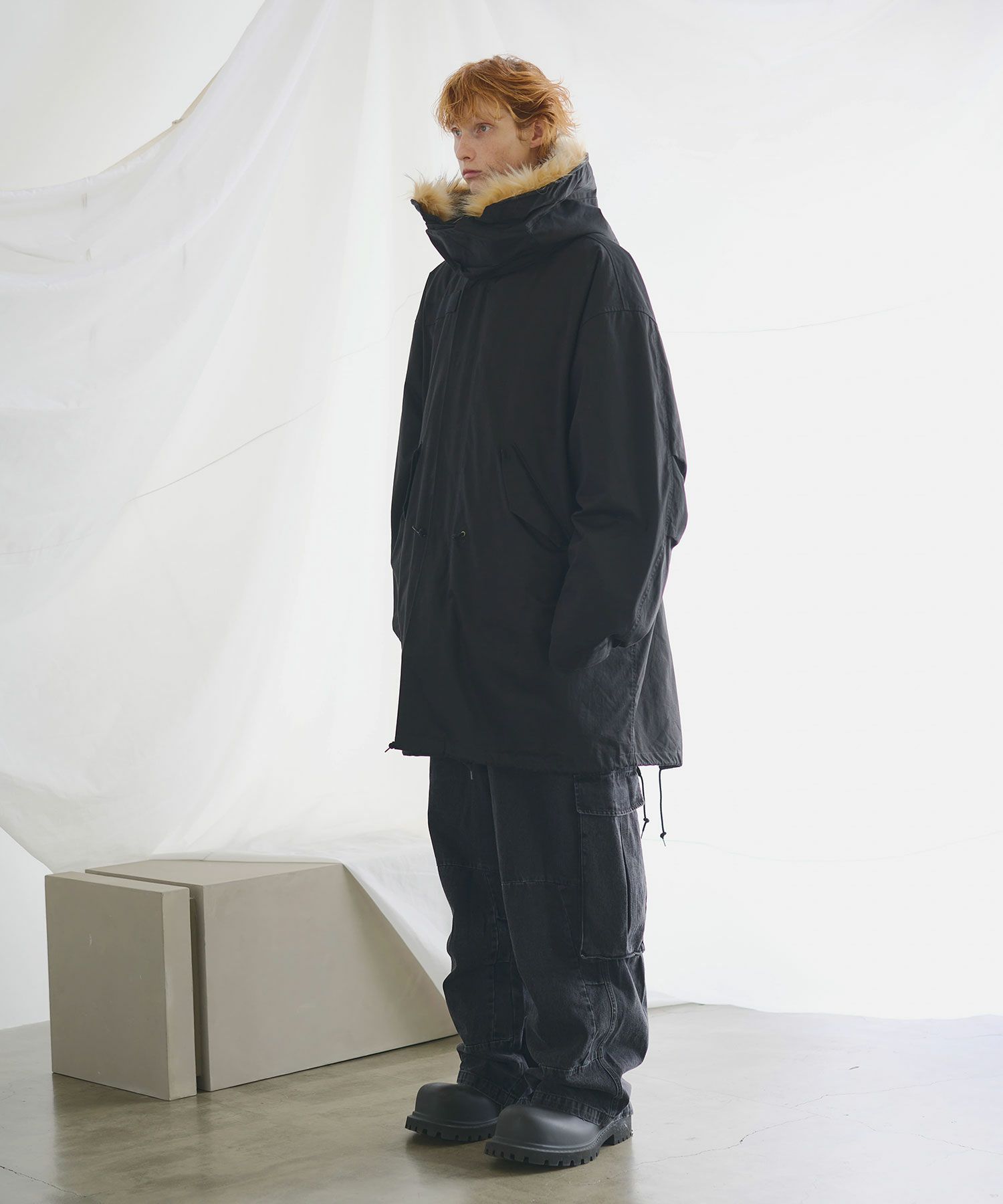 今回オリジナルで手がけているM65はフルSETで企画しており、ボリュームネックのファーフード付き。 往来のミリタリーのファーはホワイトカラーの物が多く、合わせにくい要素を現代風にアップデート。