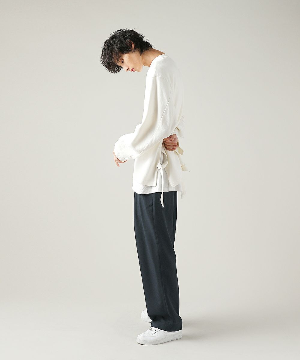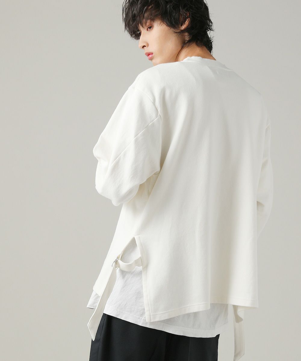 軽やかなダンボールニットを使用したスウェットになります。 2枚の生地を繋ぎ合わせた素材で、柔らかく程よい肉感ながらに軽い仕上がりとなっております。 ベーシックな見た目ながら、身幅と腕周りを大きく広げ、ドロップショルダーでヌケ感のあるシルエットに仕上げております。 サイドのスリット部分にはベルトが付いており、サイズの調整の他にアクセントにもなっております。同素材のニットキャップと組み合わせも可能です。