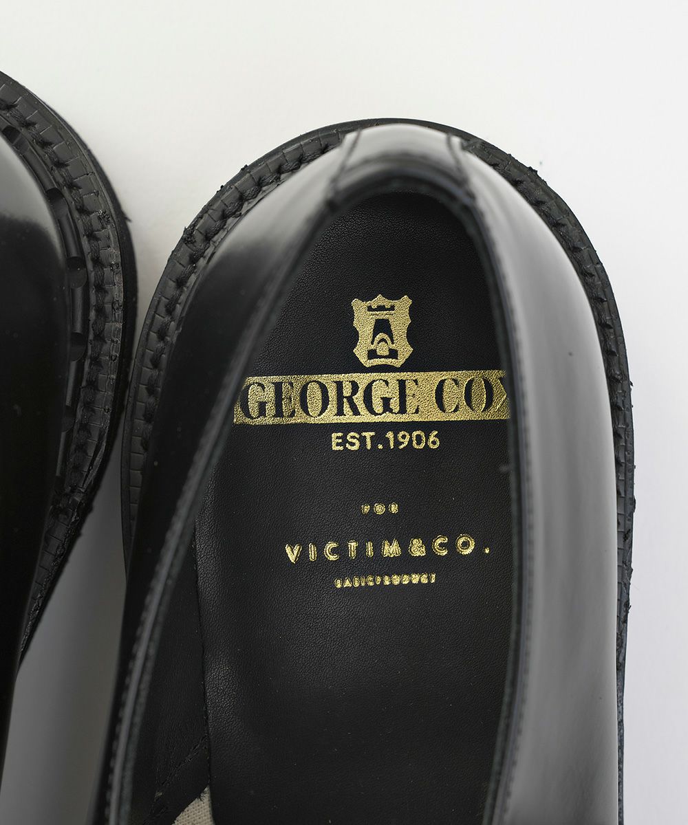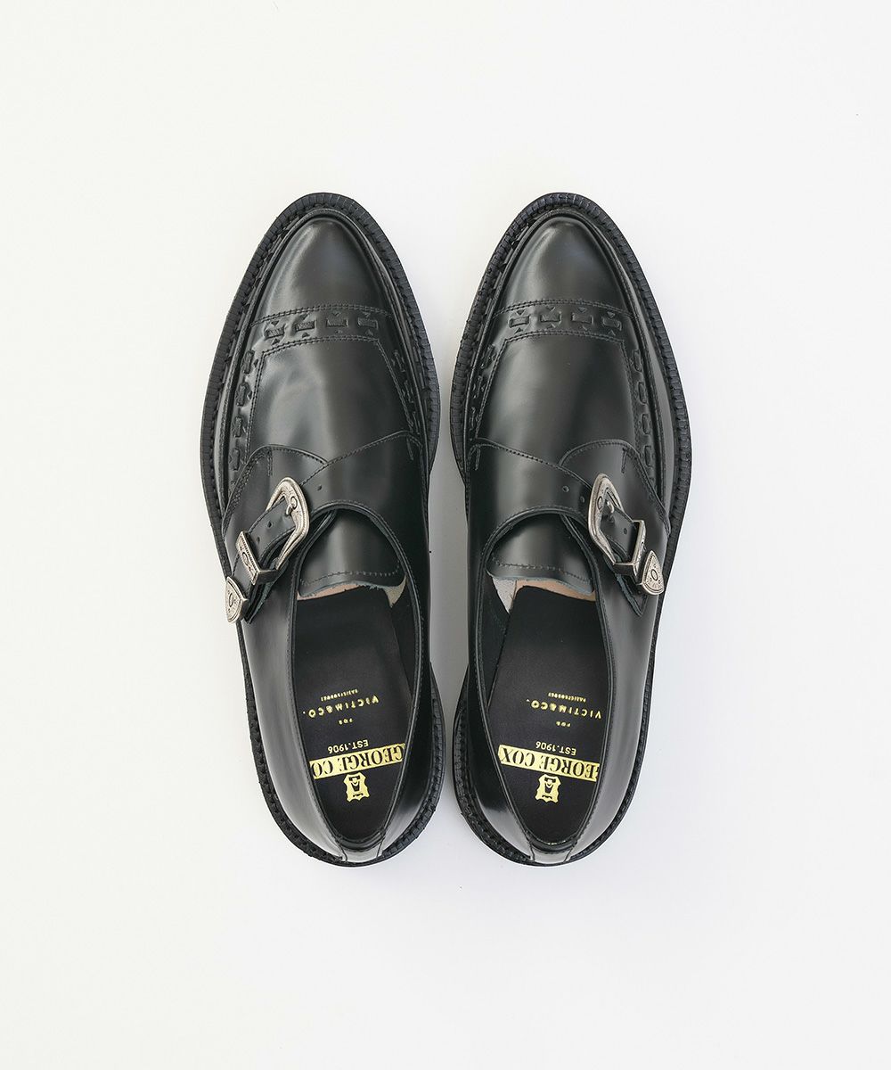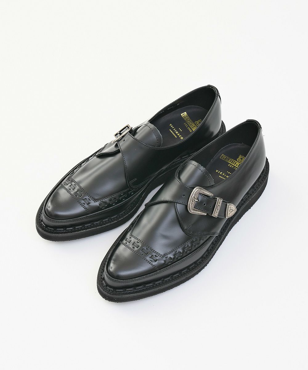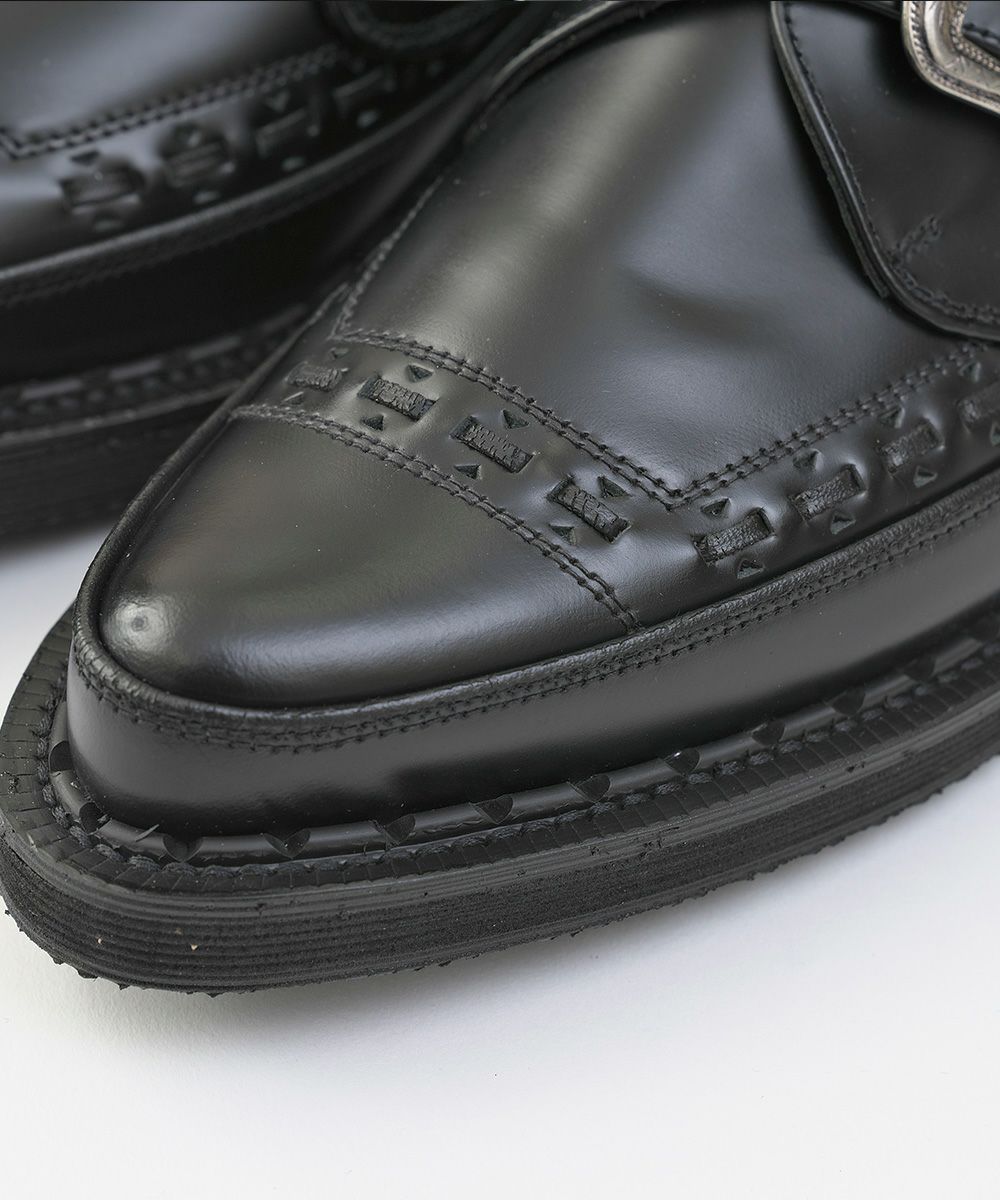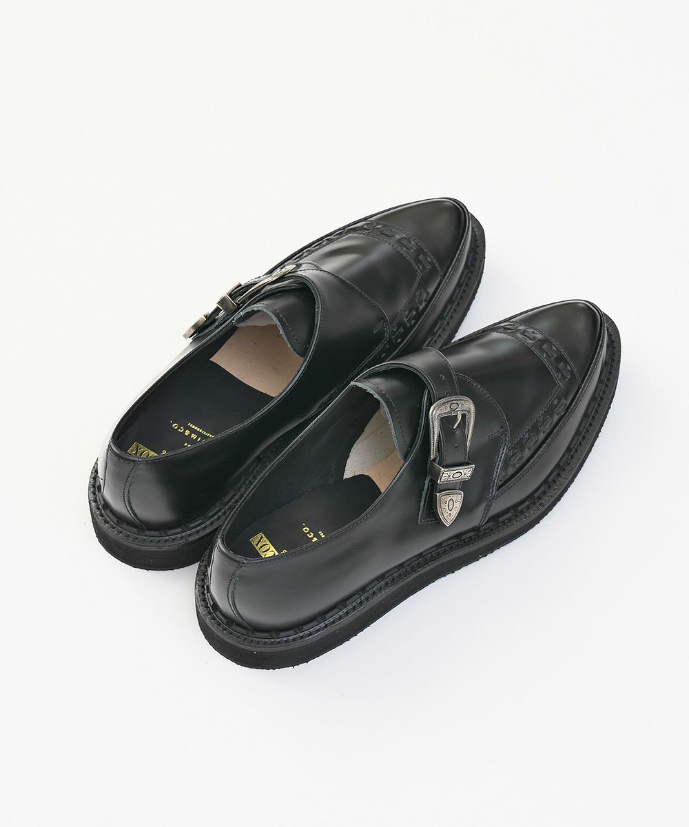 イギリスのGEORGE COXに別注したレザーシューズ。現在生産終了しているモデルを弊社で復刻再現させていただきました。 シャープな見た目と甲上部分のデザインのアクセント、ベルトバックルが特徴のモデルで、ベルトバックルにはメタルバックルを使用しており、 スタイリングのアクセントにお使い頂けます。ソールには柔らかく軽量でクッション性も高く、劣化がし難いEVAソールを採用しております。尚、ソールの張り替えも可能となっております。