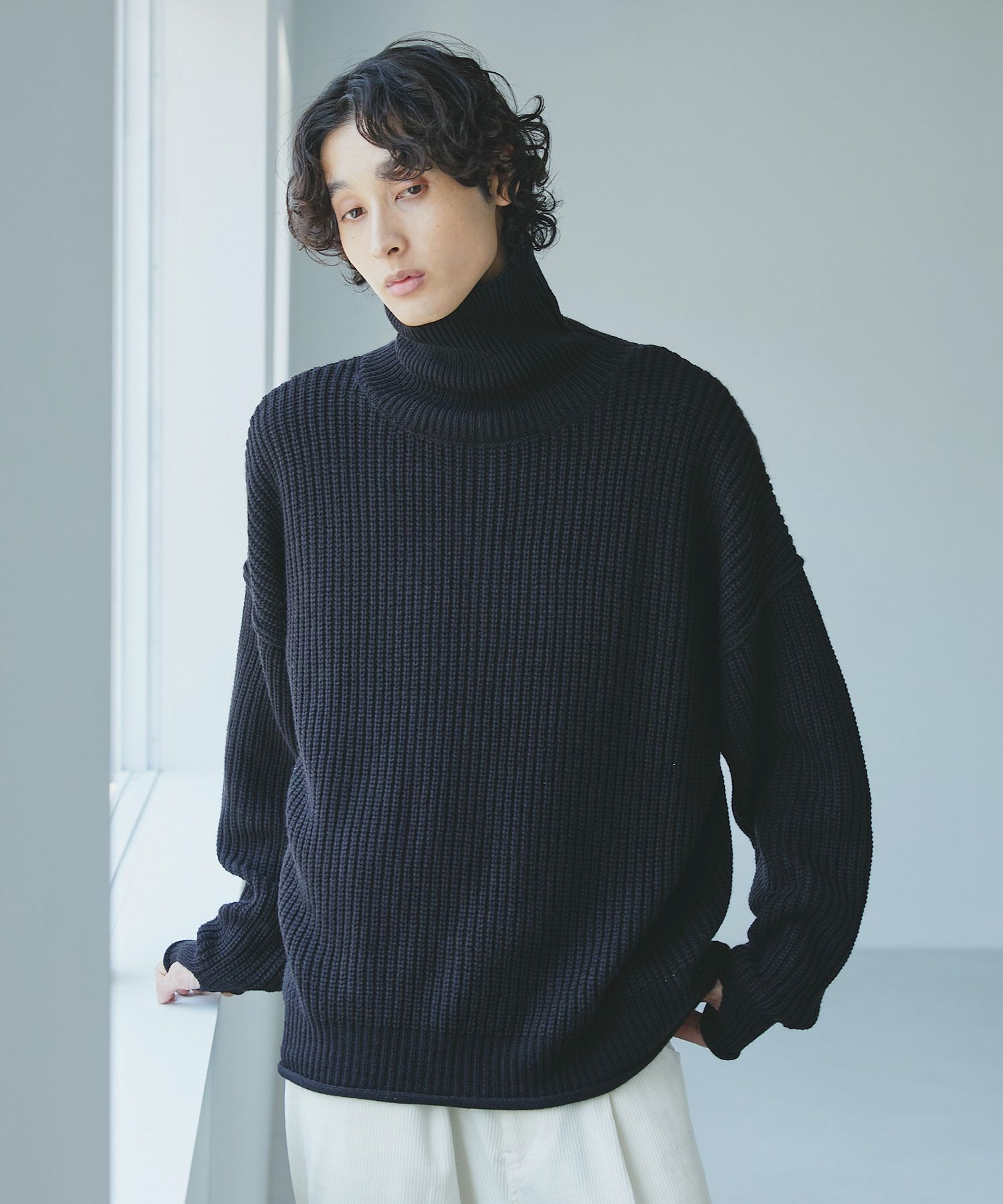 ウール×アクリルの糸を、ミドルゲージで仕上げたタートルーニット。