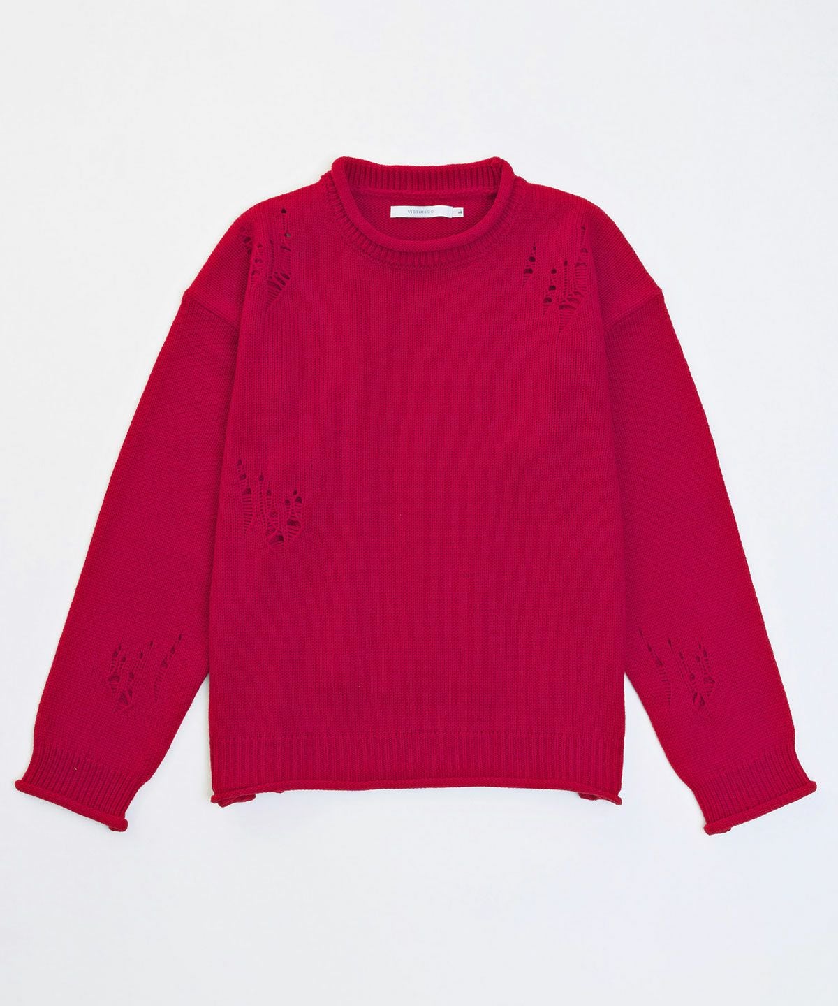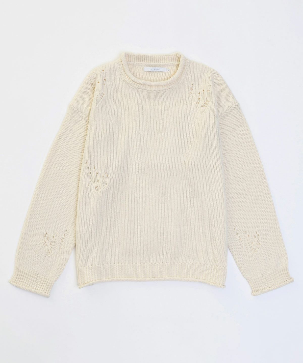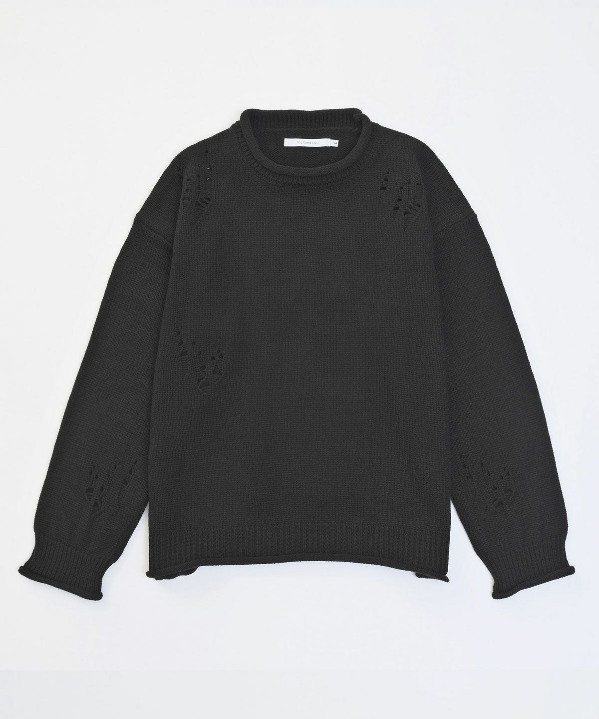 【VICTIM23AW COLLECTION】 ウール×アクリルの糸を、ミドルゲージで仕上げたクルーネックニット。 秋口や冬のインナーとしてお使いいただける様に、緩めで柔らかく編み、着心地を重視した作りとなっております。 程よくゆったりとしたシルエットで、伸縮性が高く、ストレスのないリラックスした仕上がりとなっております。 随所に施したダメージ加工と、ロールしたリブ端など、シンプルなアイテムの各所にアクセントを付けております。