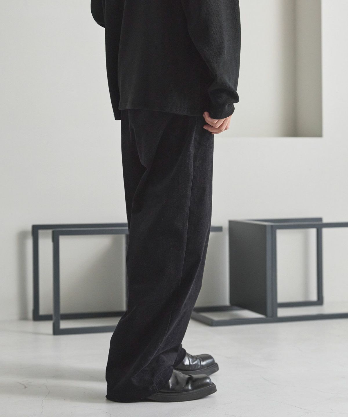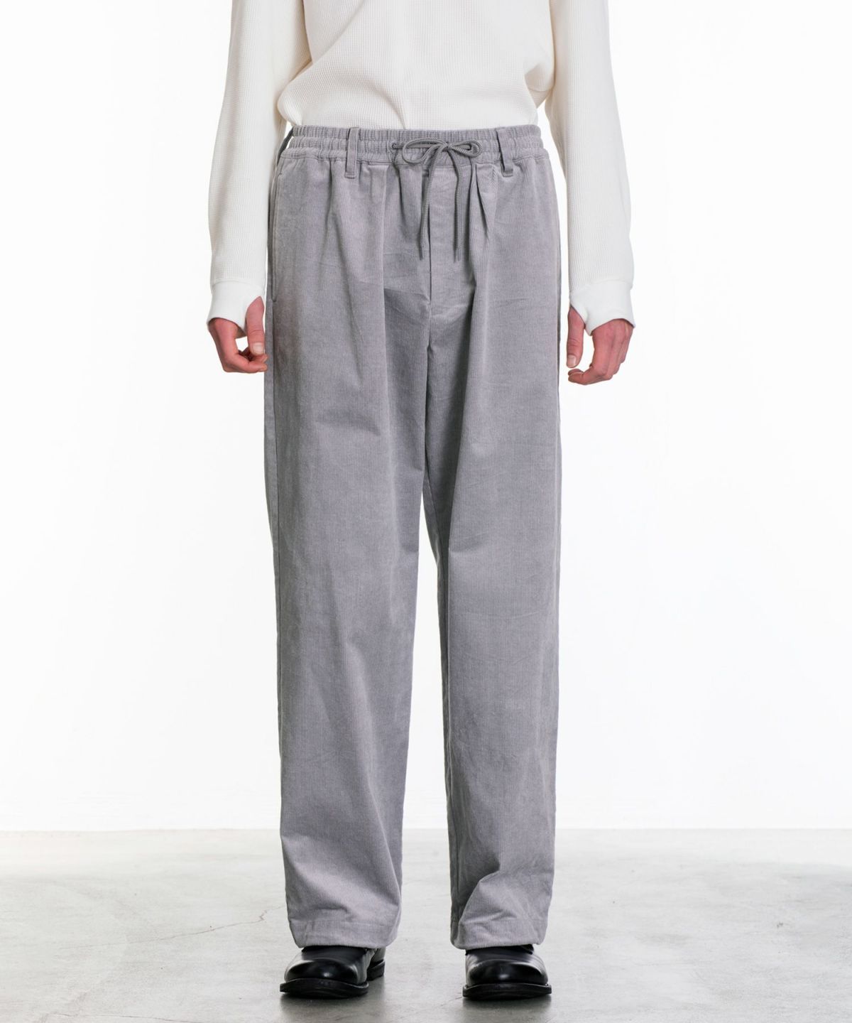太畝のコーデュロイ素材を使用したイージーパンツ。 厚手で膨らみのある風合いで、ソフトな肌触りと、程よい起毛感が温かみのある表情を生み出しております。ゆったりとしたシルエットですが、 柔らかで程よく落ち感のあるリラックスした仕上がりとなっております。太畝のコーデュロイ素材で、ストレートシルエットなのでスタイリングに取り入れやすく、 アクセントにもなるアイテムです。ウエストにはゴム、裾にドローコードがついております。