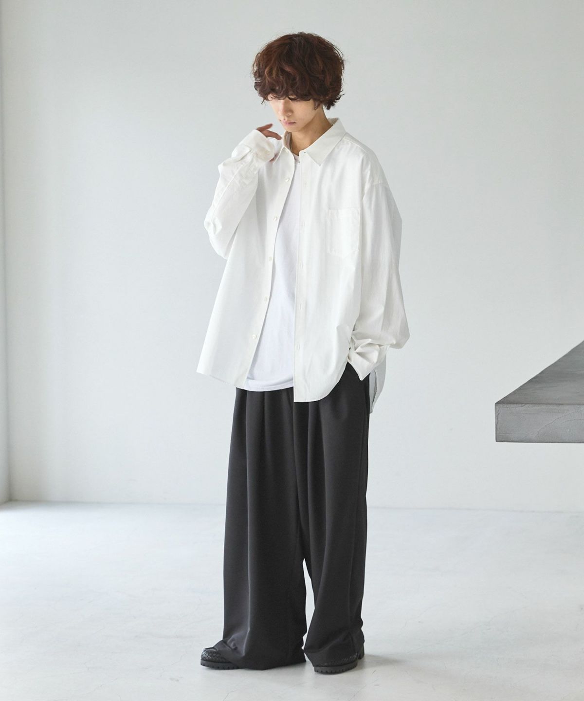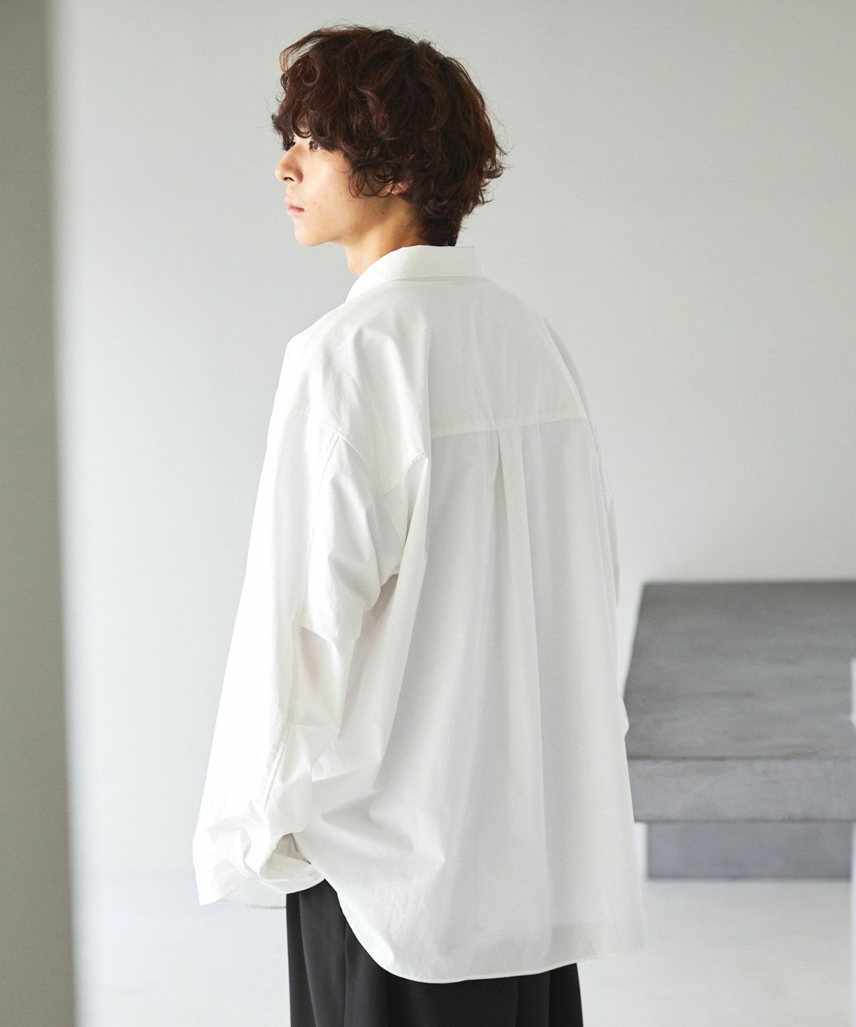 清涼感のある生地を使用したビッグシャツ。 シャリ感のあるタイプライター生地で、涼しげなカラー展開となっております。ゆったりとリラックスした大きめなシャツに仕上げました。 身幅と腕周りを大きく広げ、ma-1のような前振り袖を採用。ミリタリージャケットに見られる肘のタックを加え、ドロップショルダーでヌケ感のあるシルエットに仕上げております。シンプルながらに大きめなサイズと腕周りのシルエットがアクセントになる1着となっております。